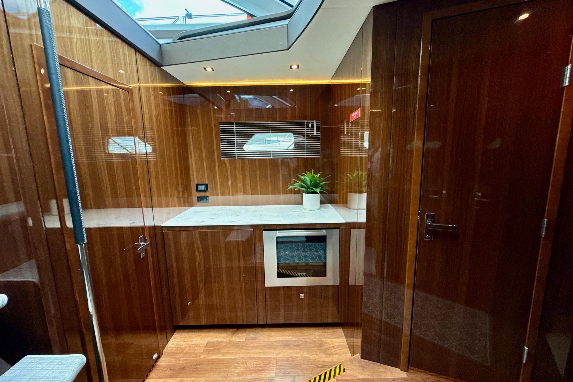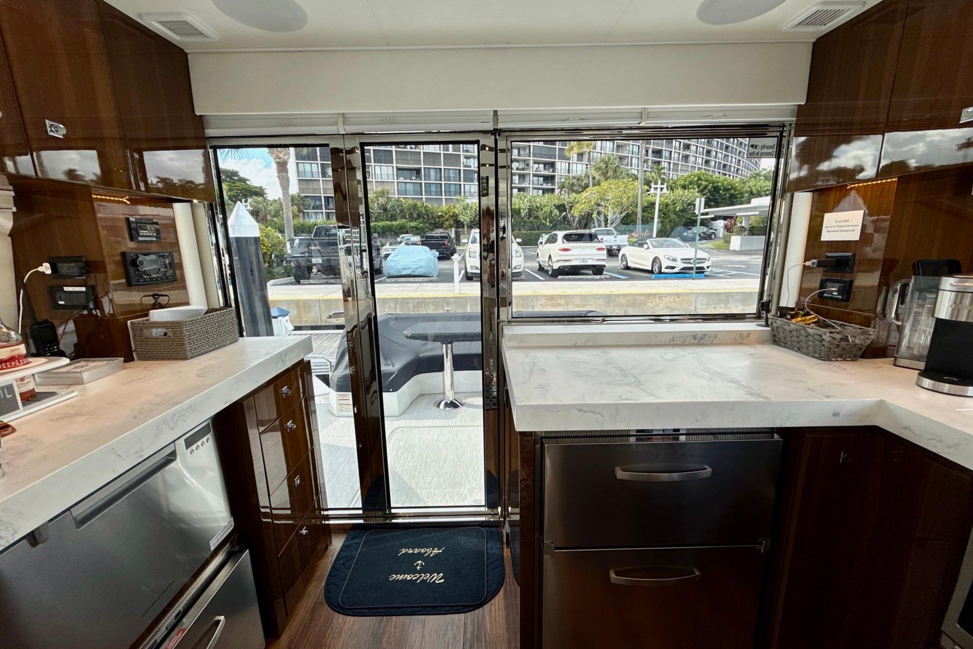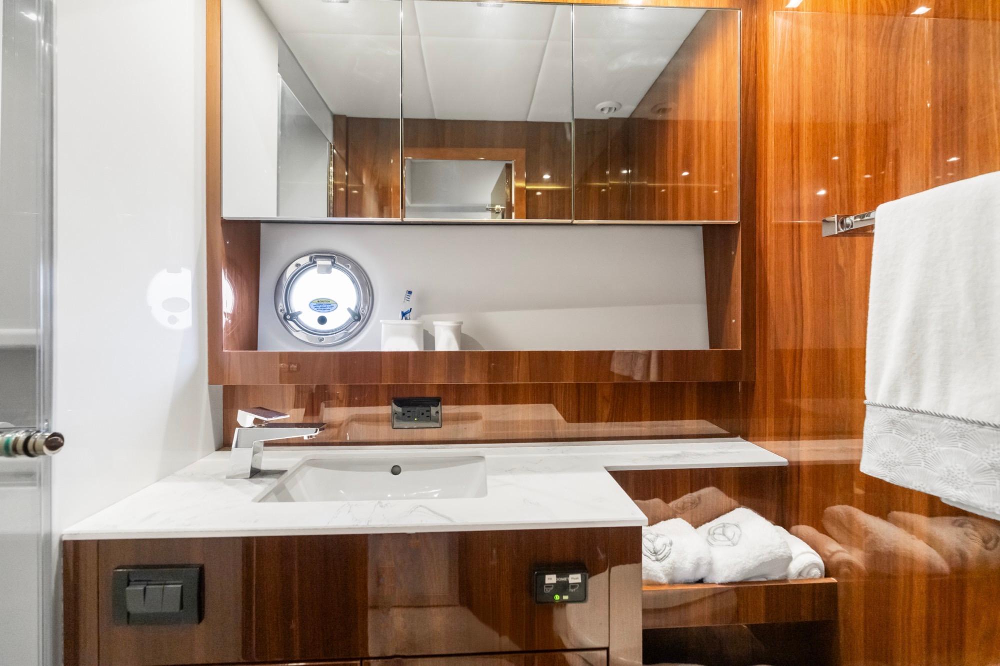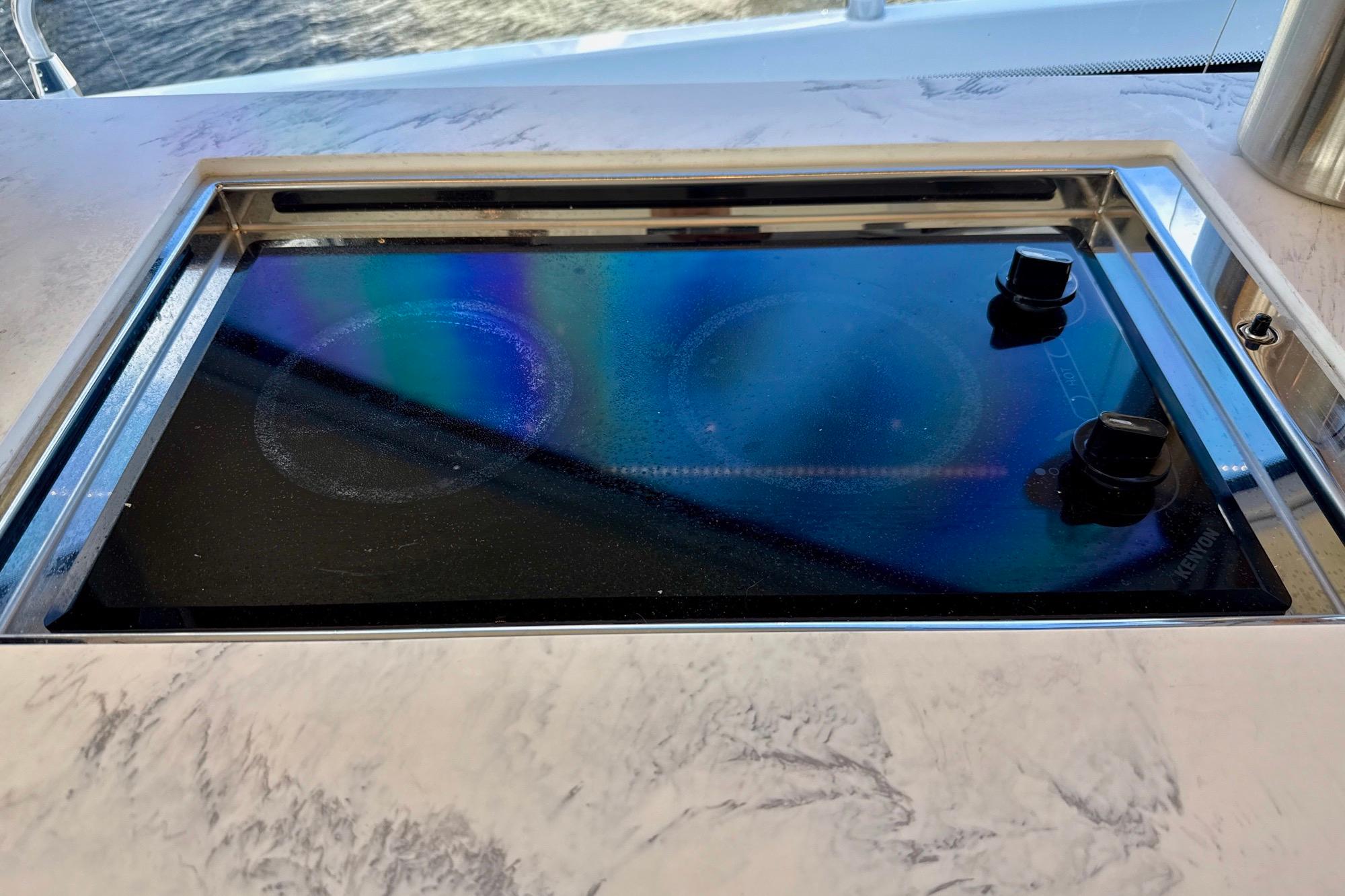 - Galley to port – convection microwave, dual drawer fridges/freezers, dishwasher, deep stainless sink with modern fixture, ample storage
