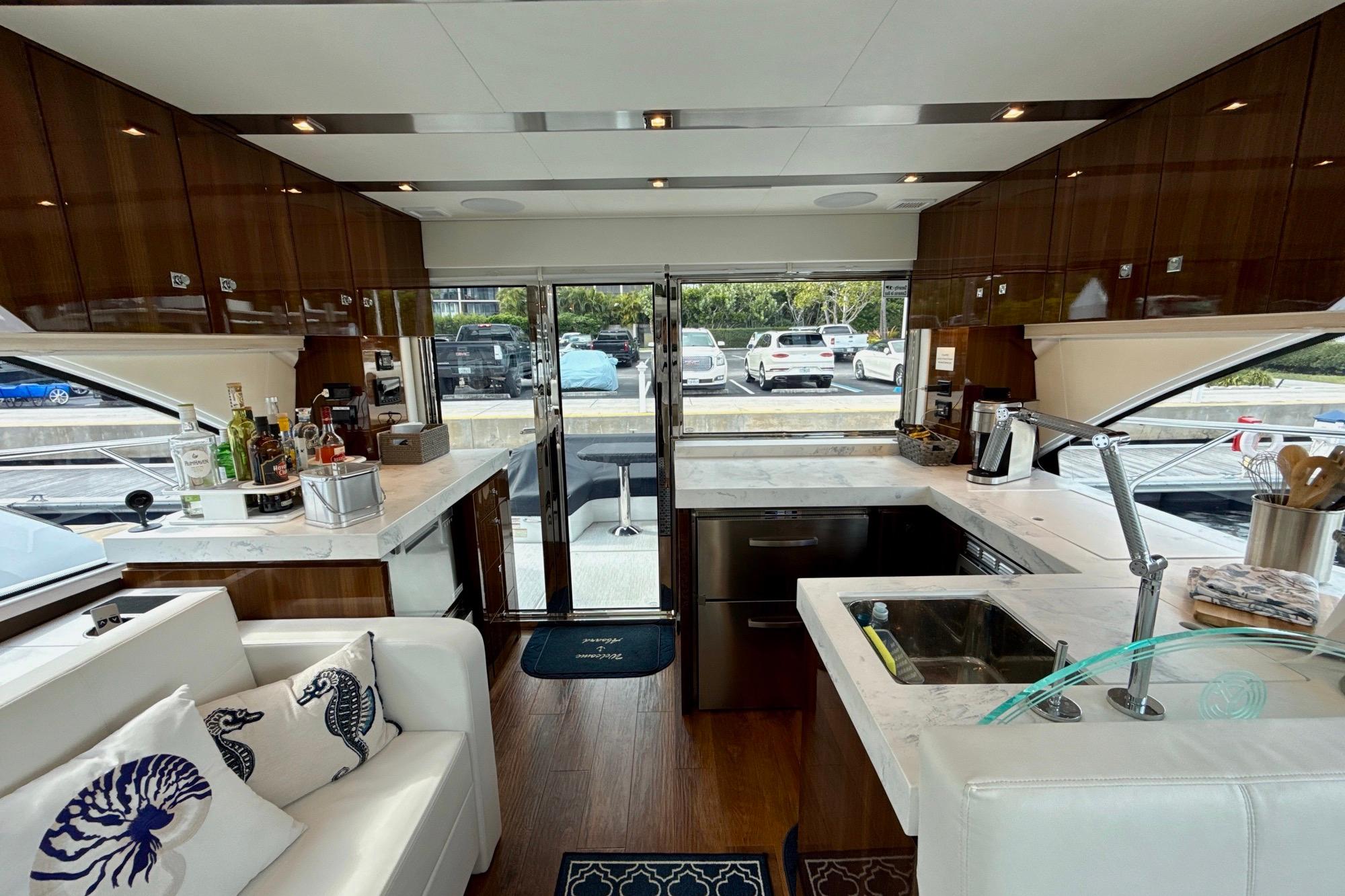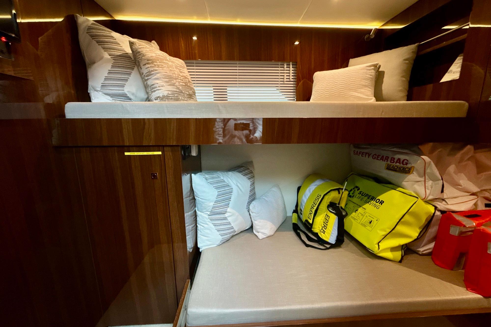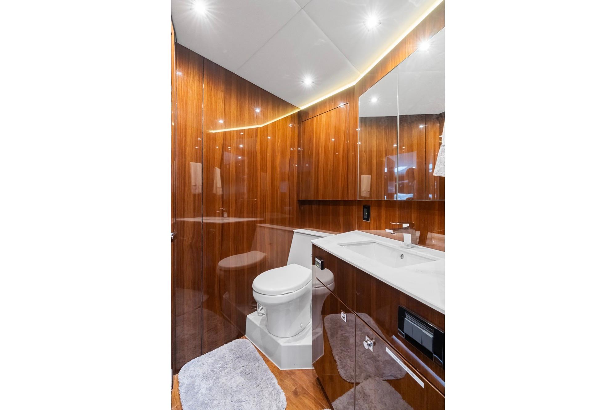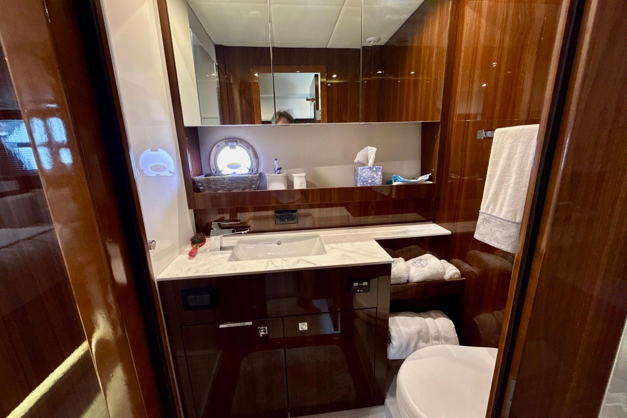 - Galley to port – convection microwave, dual drawer fridges/freezers, dishwasher, deep stainless sink with modern fixture, ample storage