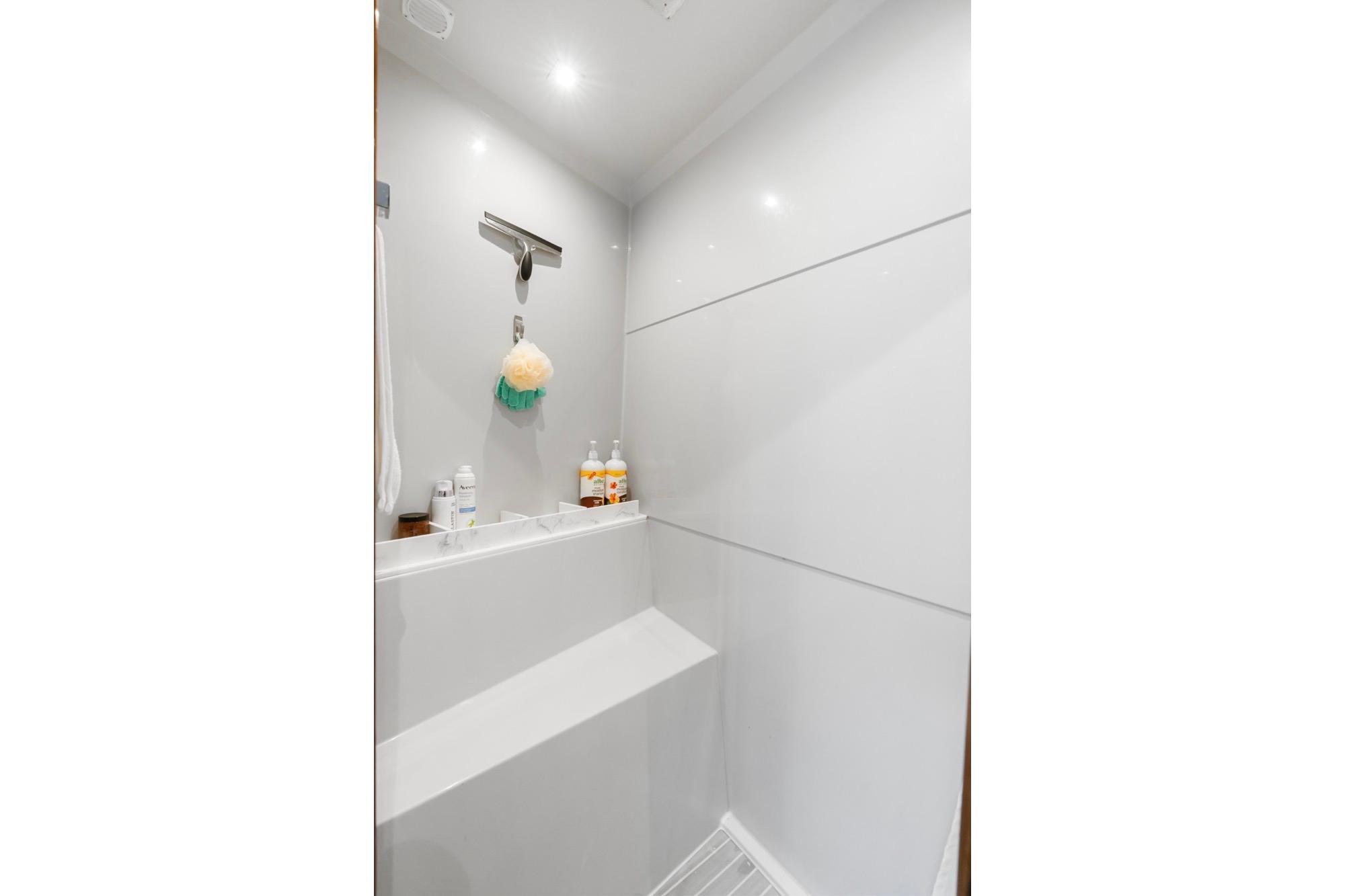 - En-suite head with separate rainfall shower, tile accent wall, and designer fixtures