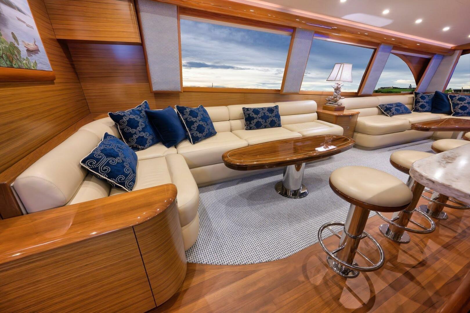 SalonThe salon is beautifully appointed with spectacular horizontal-cut teak throughout, offering a warm yet modern aesthetic. Generous seating includes a luxurious L-shaped sofa, matching L-shaped dinette, and four custom bar stools that complement the galley bar, perfect for entertaining guests in comfort and style.