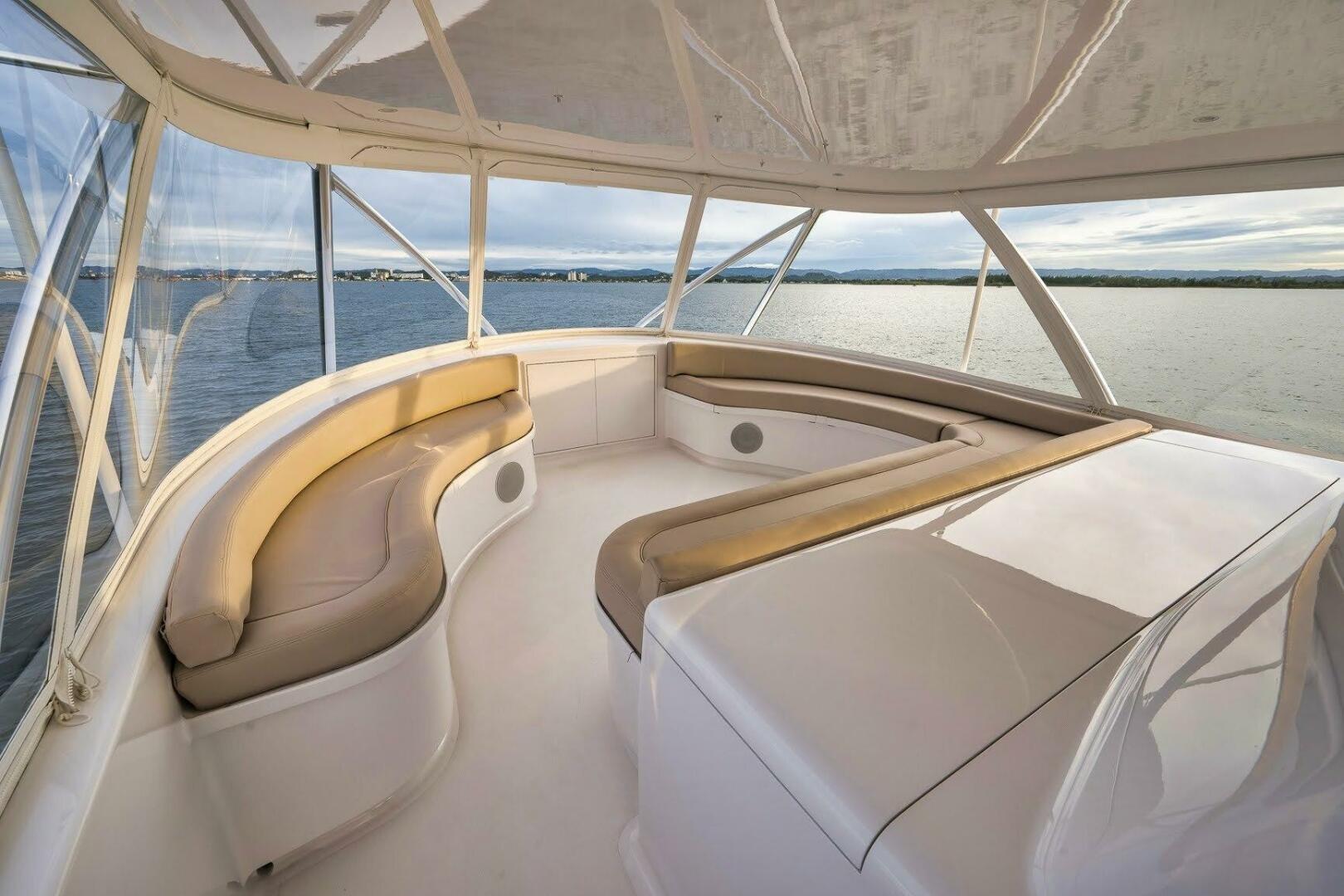 The mezzanine features abundant tackle storage, multiple refrigerated compartments, and seating for up to six anglers. Completing the space are newly beautiful finished teak decks and covering board.