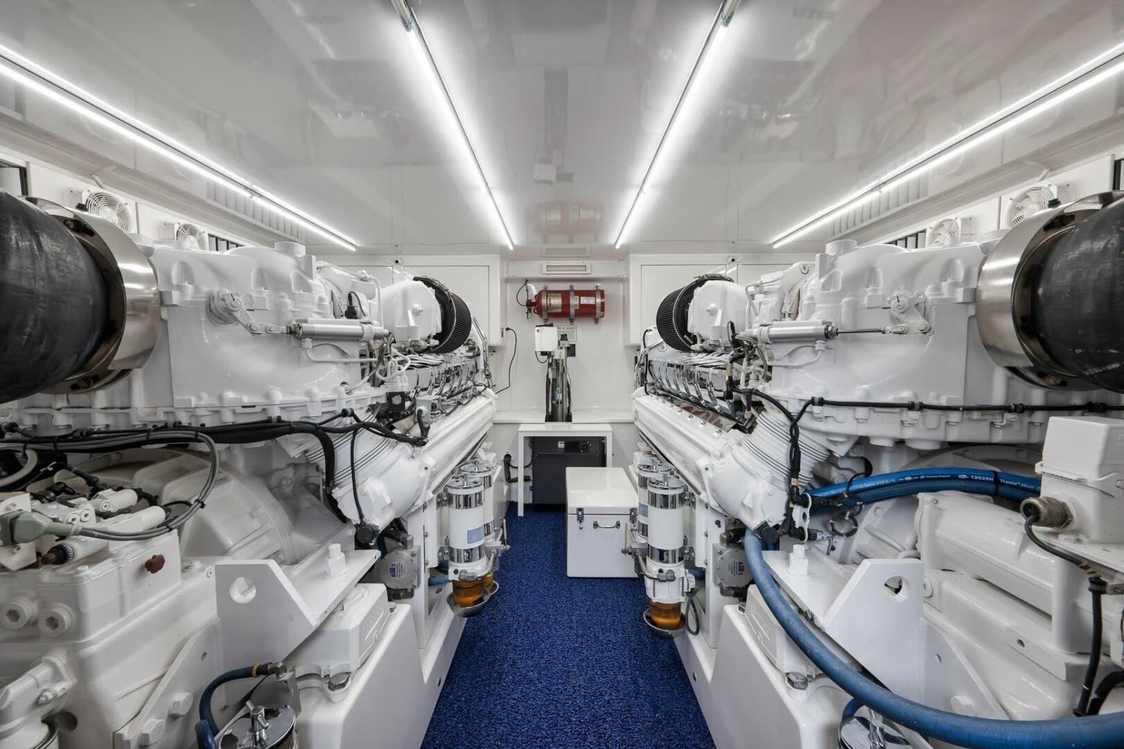 Islamar’s engine room is absolutely pristine, an immaculate showcase of thoughtful engineering and meticulous upkeep. Every surface gleams with brilliant Awlgrip white, creating a bright and clean work space. Lightly used by her original owner and very well laid out for ease of maintenance, this well organized workspace highlights a superior level of craftsmanship and attention to detail.