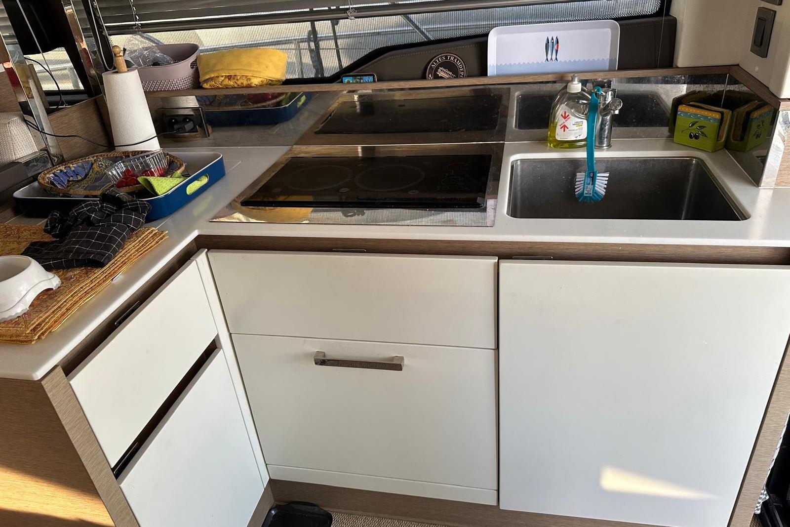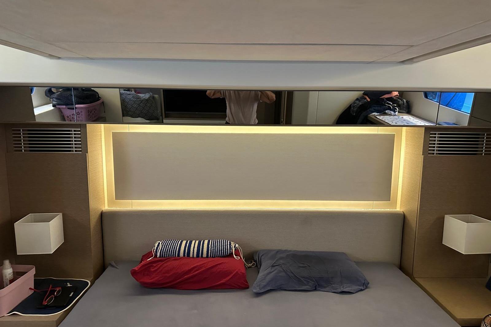 Inside, her bright, modern interior features grey oak finishes, matching wood floors, and premium carpeting. She offers two large cabins, two bathrooms, and a fully fitted lazarette, plus washing machine, dishwasher, and complete protective covers.