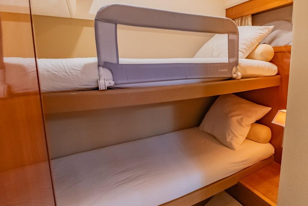 À l’intérieur, ce yacht offre 3 cabines généreuses, un atout majeur pour accueillir famille et amis. La cabine propriétaire, située à l’avant, bénéficie d’un grand lit double et de nombreux rangements. Les deux cabines invités sont également spacieuses et lumineuses, idéales pour des croisières prolongées dans le plus grand confort. Le salon intérieur, élégant et moderne, crée une atmosphère chaleureuse et conviviale, parfaite pour les soirées à bord.