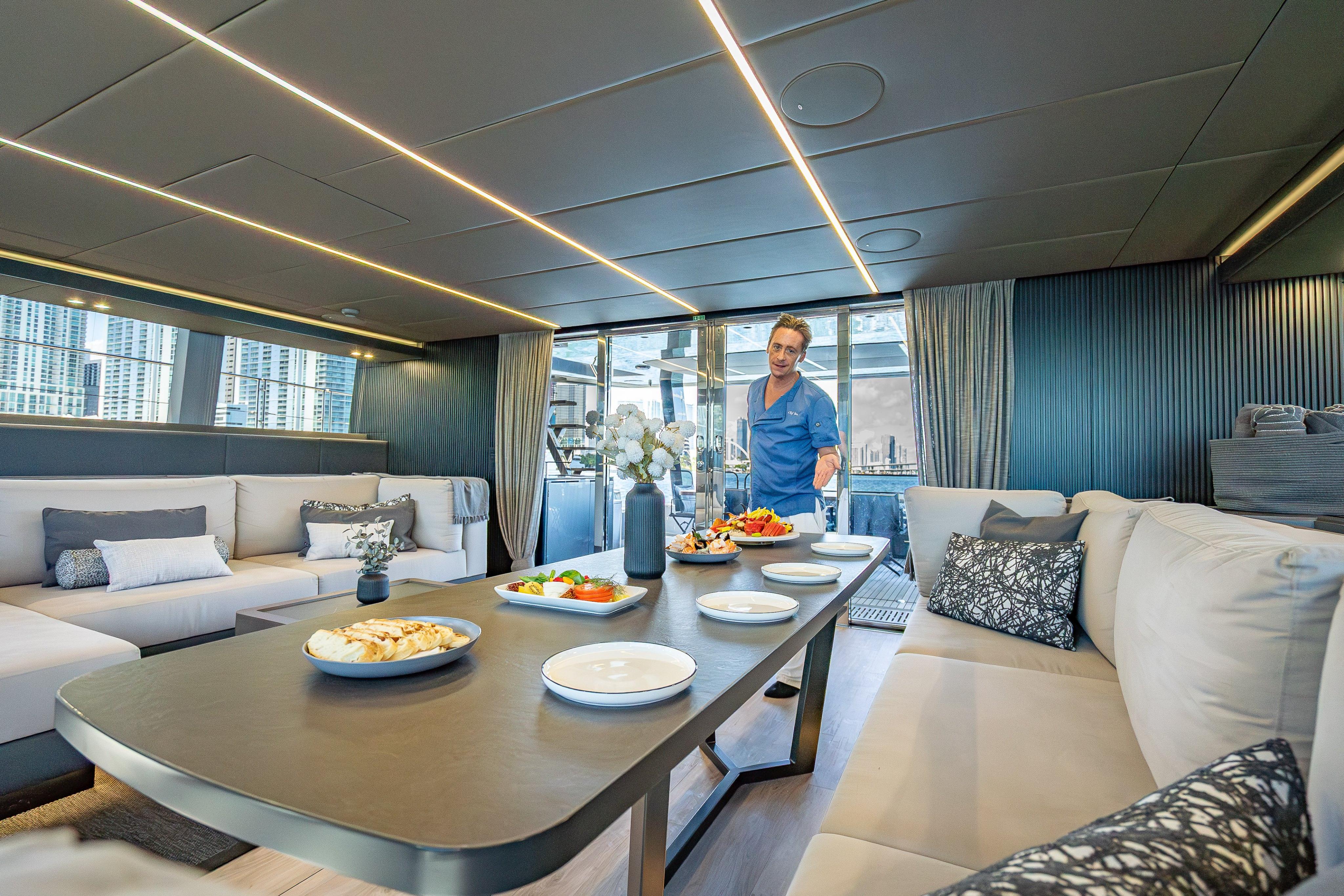 - Four luxurious staterooms: one master suite with a king-size bed and three guest cabins with queen-size beds, all featuring bespoke finishes and ample natural light.