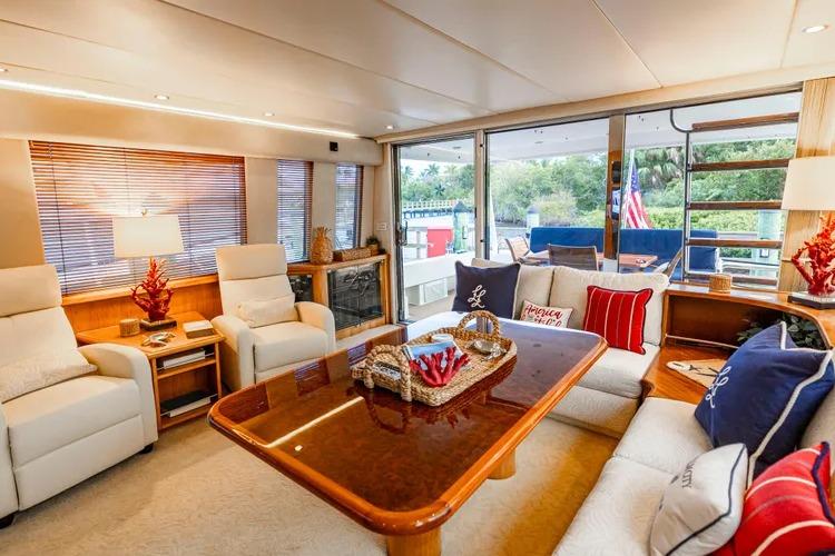 - Custom couches with L-shaped end table at aft port corner.