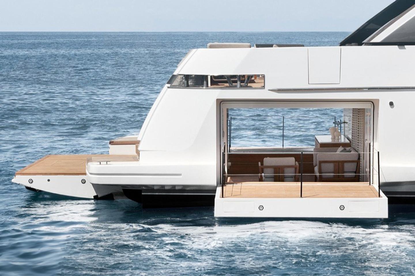 It features a bow area with sunbathing space, a tender garage at the stern, and a beach club that can be lowered to create a terrace over the water.