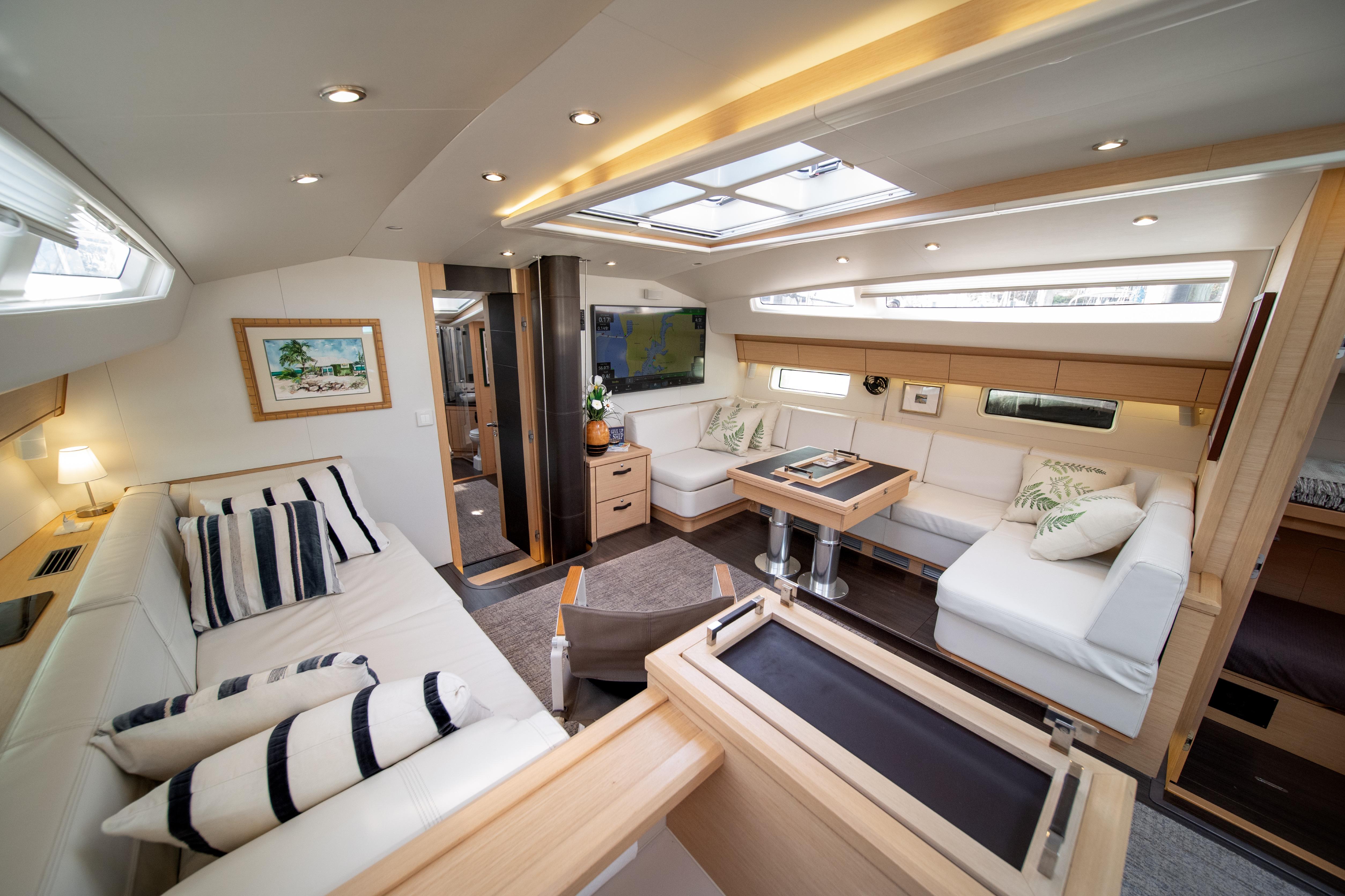 Her layout includes three cabins and three heads, with crew quarters located in the bow. Upon entering the cabin space below, natural light floods the saloon, highlighting the spaciousness. Comfortable settees with plush upholstery surround a large custom table that folds to seat eight or more, perfect for entertaining.