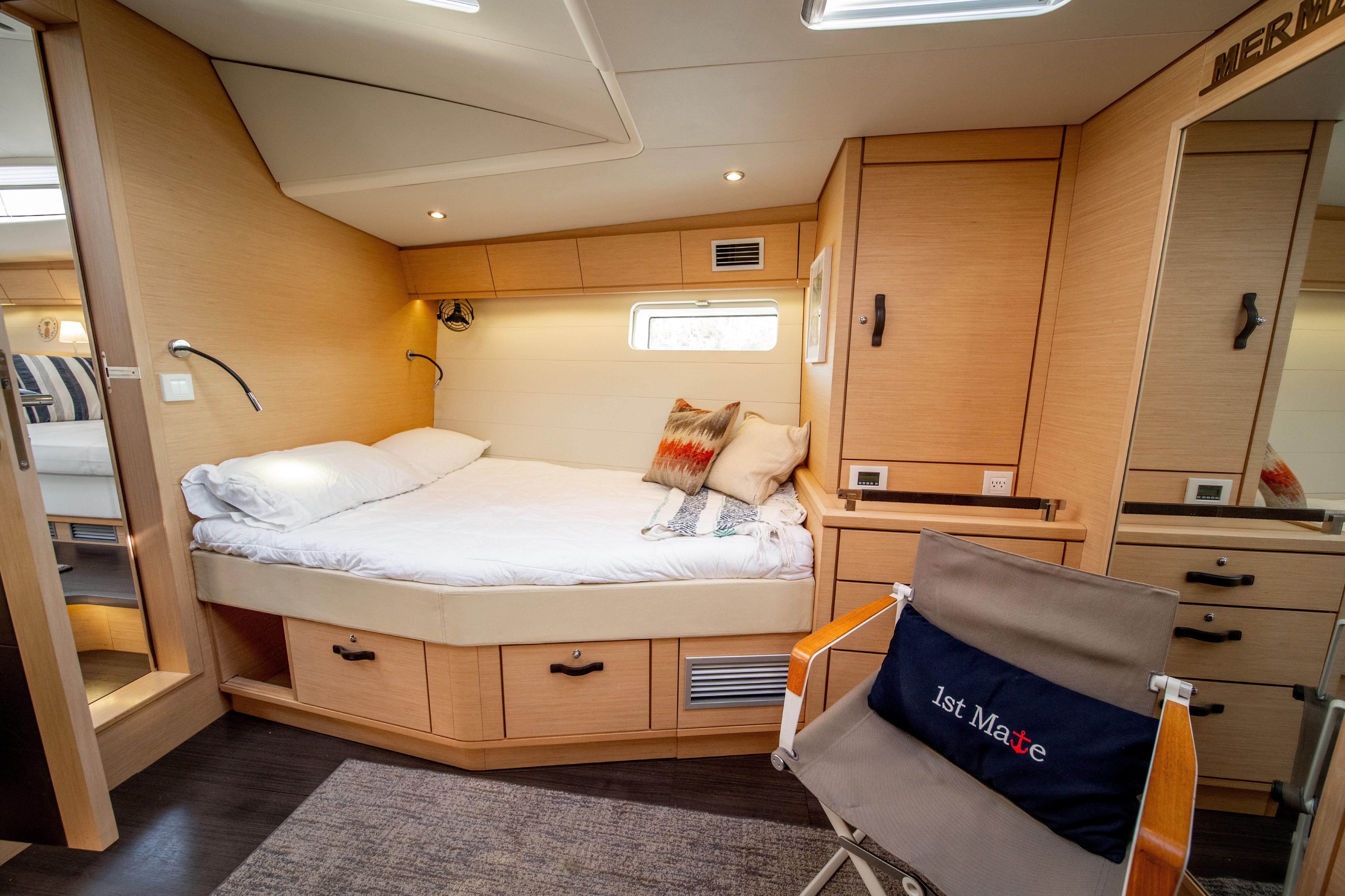 On the starboard side, the mid-ship stateroom offers two stacked bunks—creating a stable sleeping platform at sea—and houses access to the engine room, as well as the washer and dryer.
