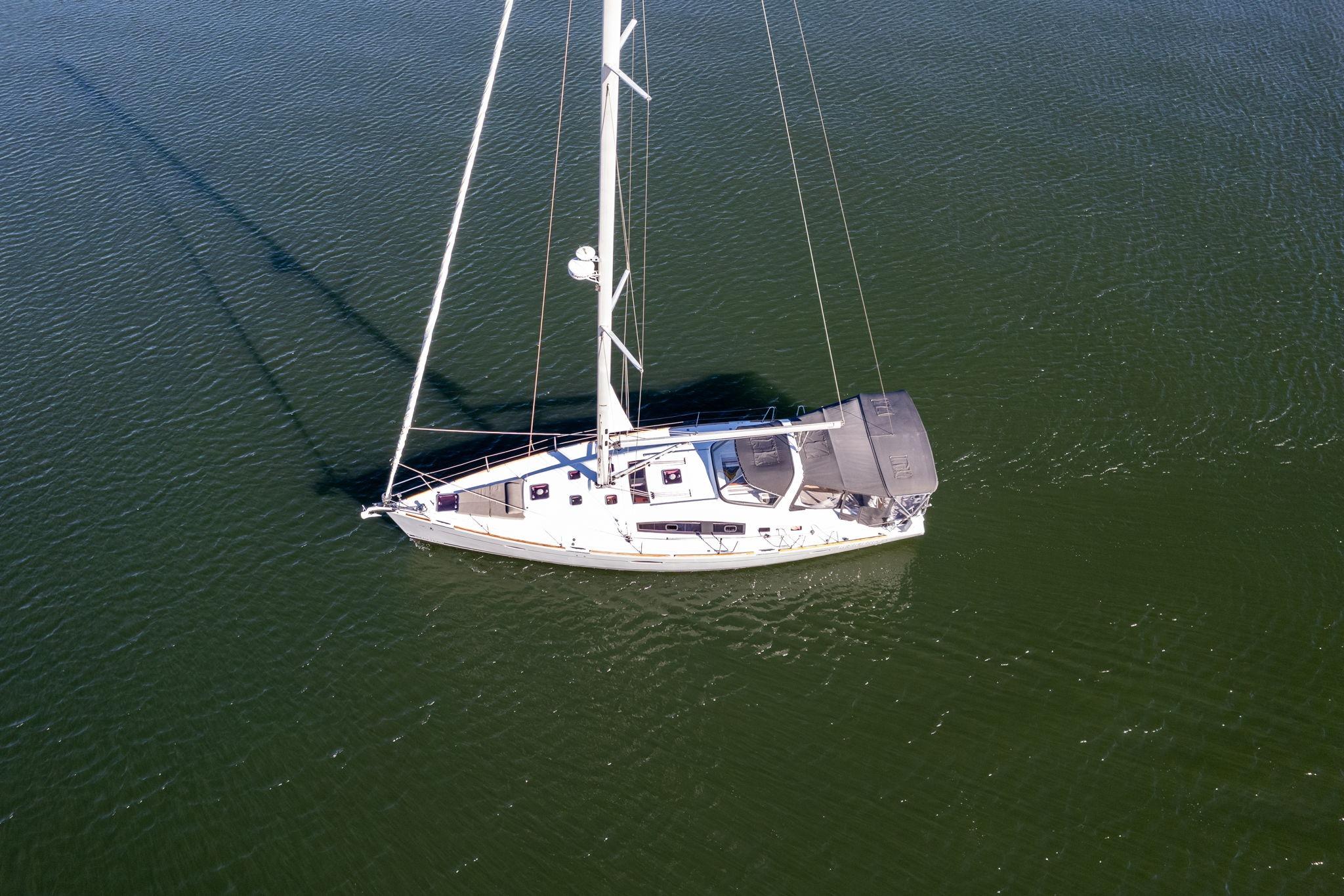 Her exterior presents beautifully with Sunbrella custom Dodger and Bimini, premium cockpit cushions, a generous teak cockpit, dual helm stations, and upgraded Harken electric winches that make short-handed sailing easy. A furling mainsail and furling genoa add to the simplicity and manageability underway.