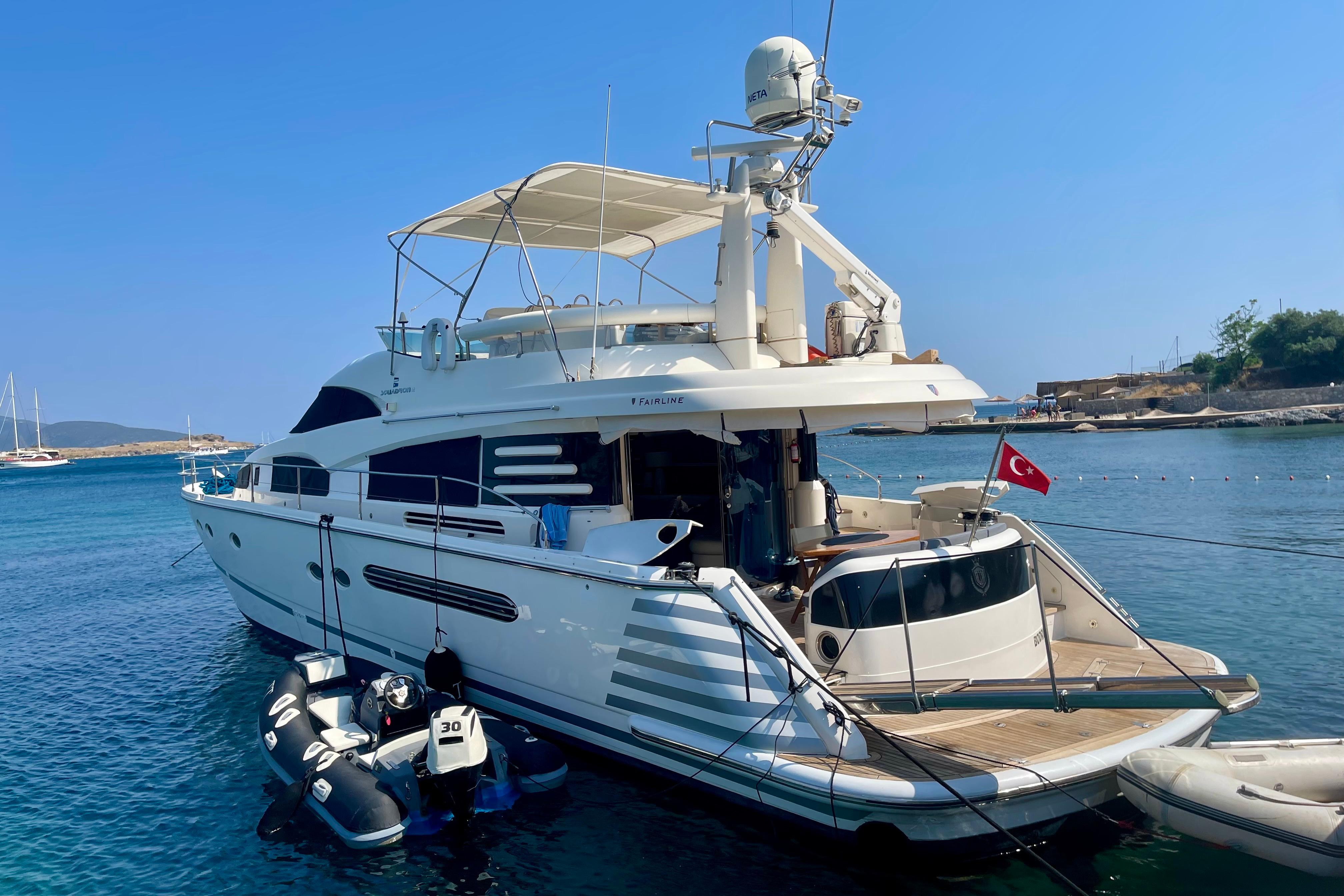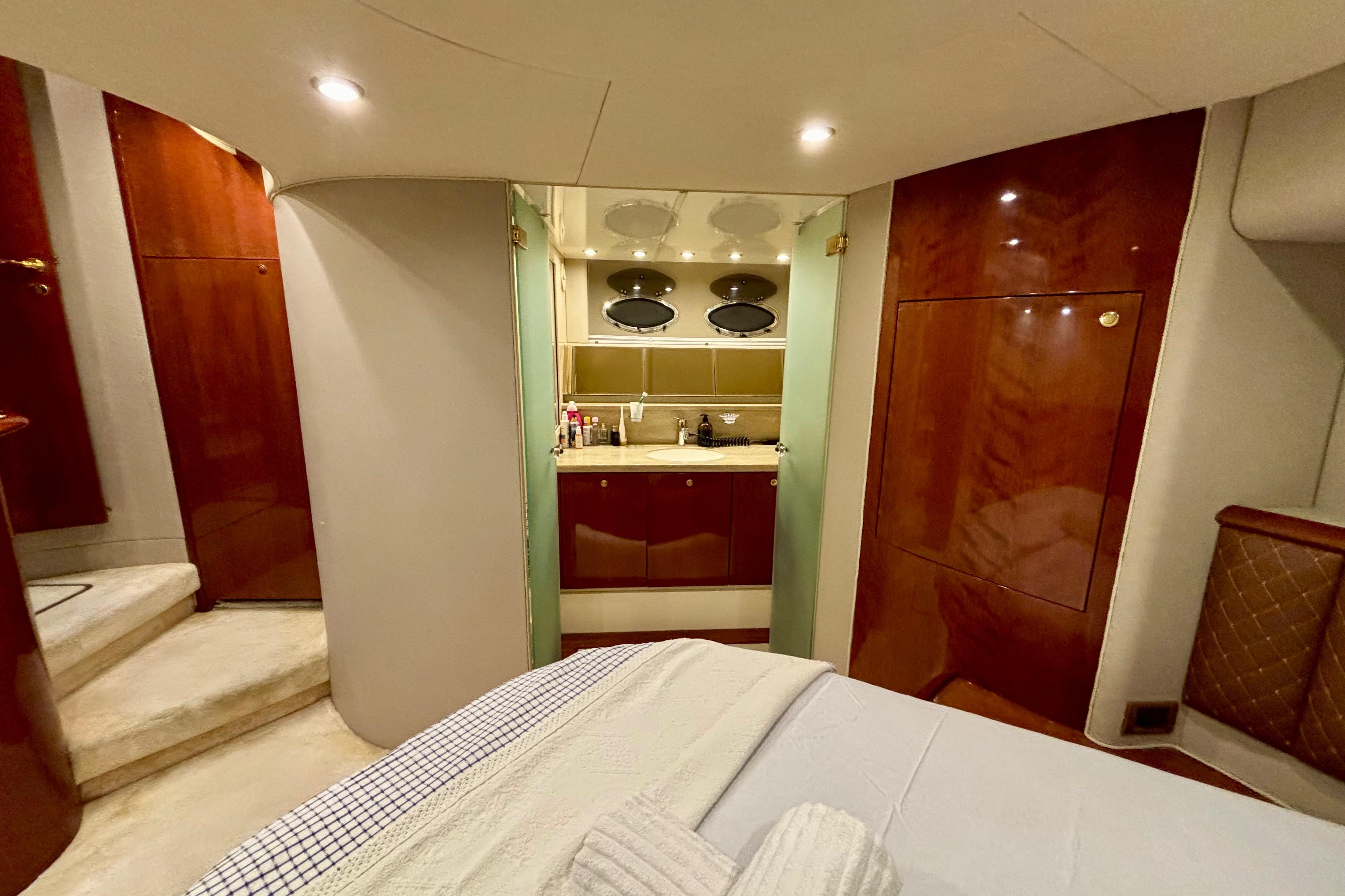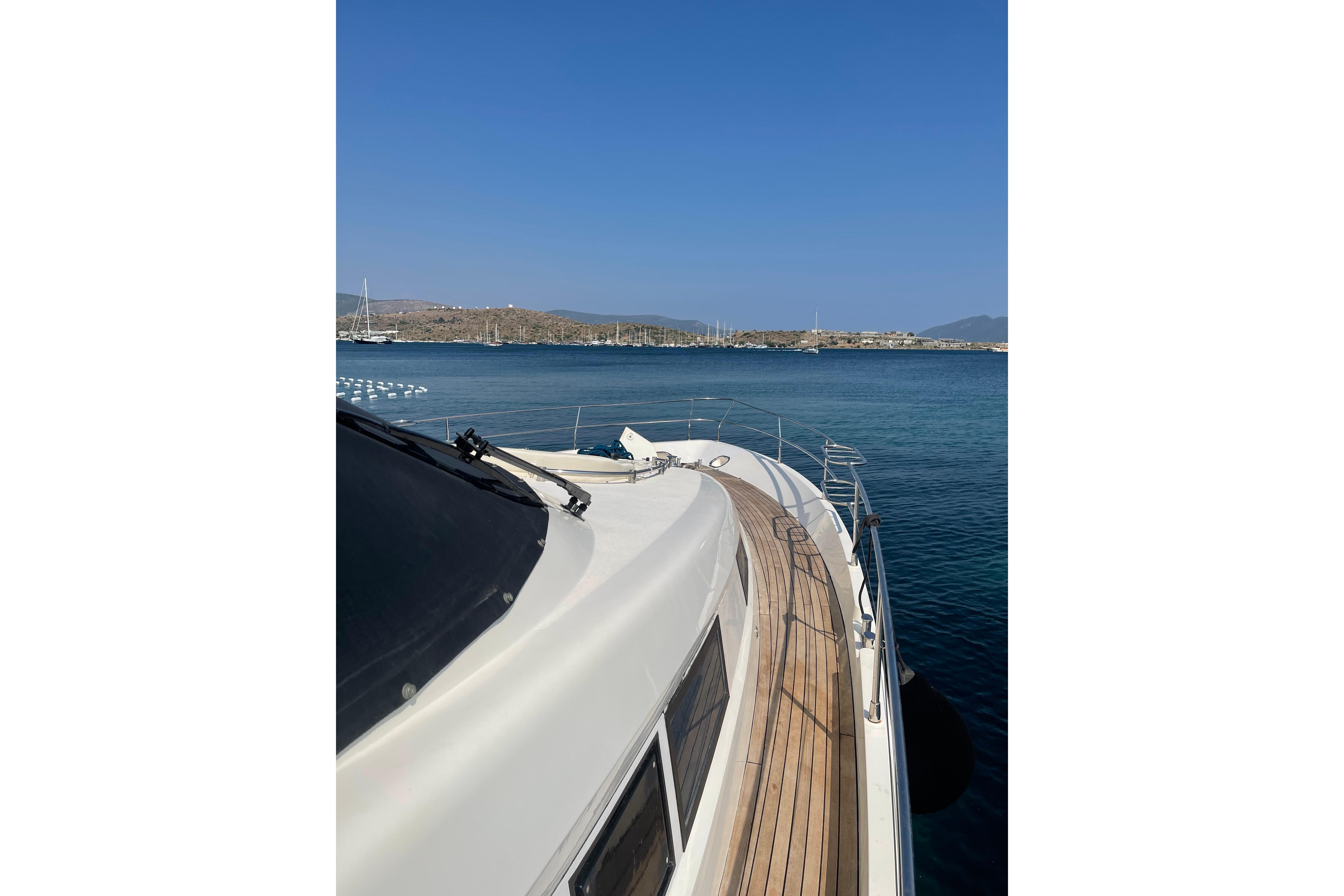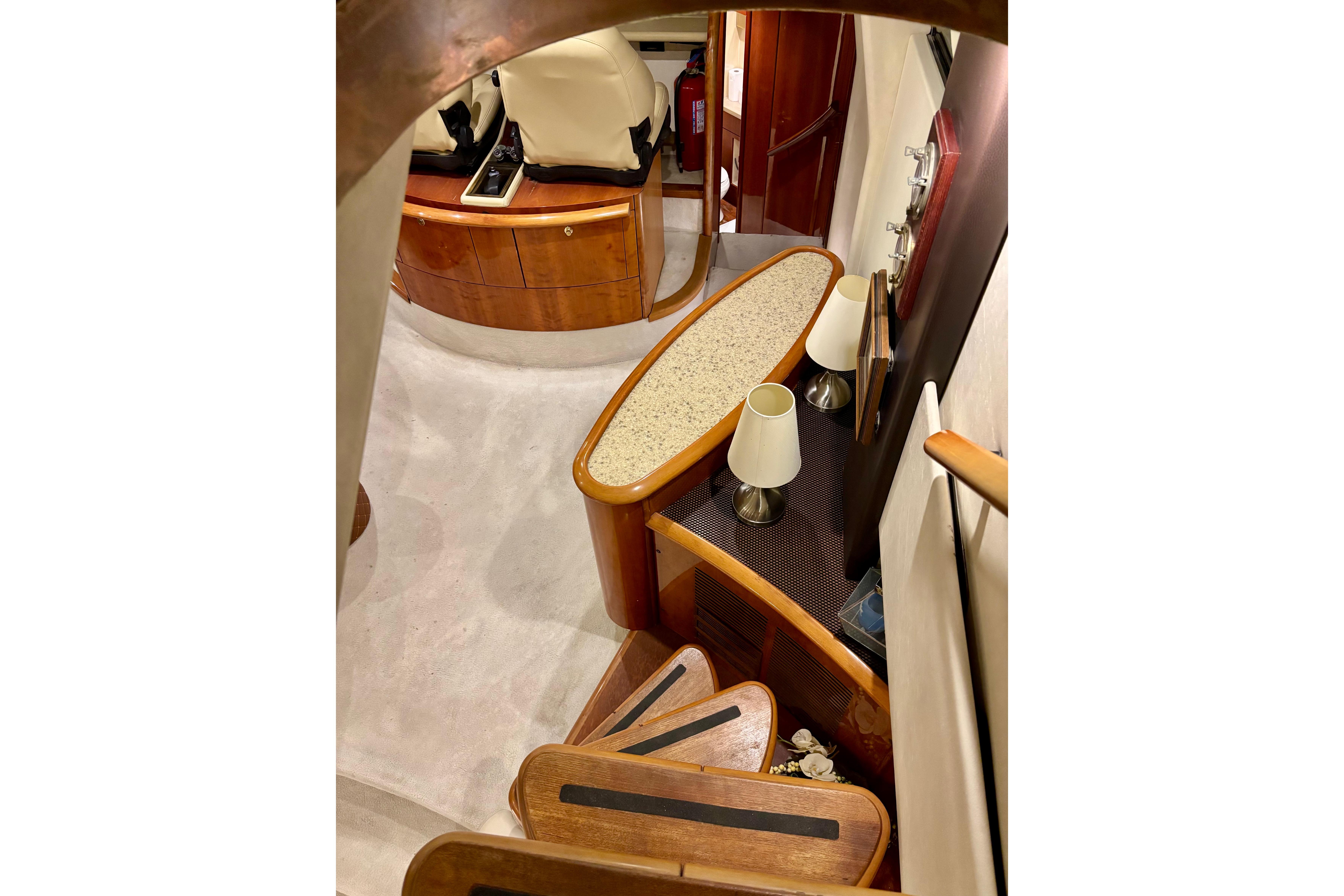 The Fairline Squadron 62 invokes the secure and confident feeling of a much larger boat - especially when passengers walk around the solid, wide, bulwark-edged decks for the first time. The large elegant flybridge is sociable in the truest sense of the word, with its commanding centerline helm position, two adjoining crew seats, and a large sunbed directly in front of the helm. The design is mirrored by the oval-shaped seating and dining area, where the bar unit, sink, fridge, and electric barbecue griddle are de rigeur. Quite apart from its eight-seater settee arrangement, the spectacular saloon features a raised dining area with a six-seater table, and a separate bar area with its own fridge, icemaker, and bar stools. The central lower helm position has electrically adjustable seats, a wrap-round control console, and immediate access to the side deck through an aircraft-style side door.