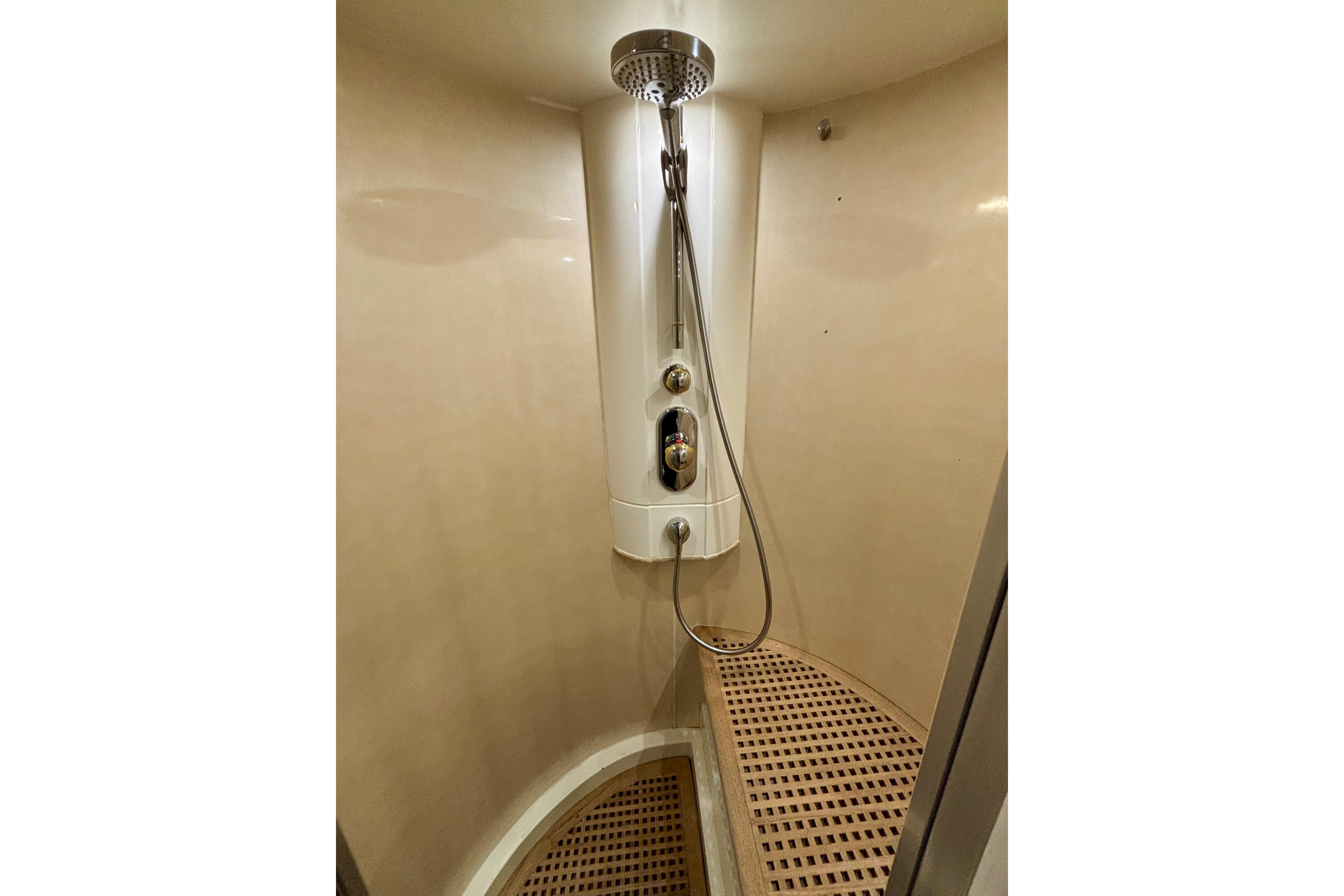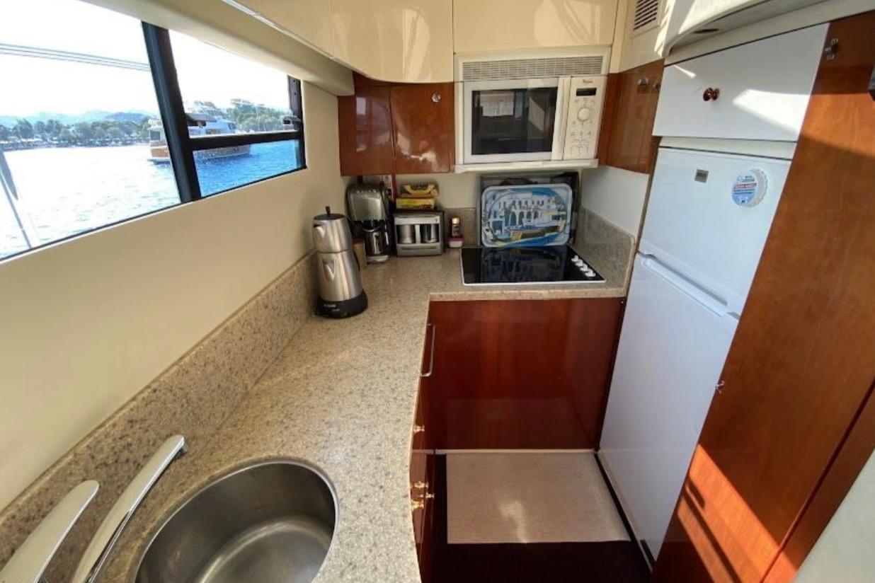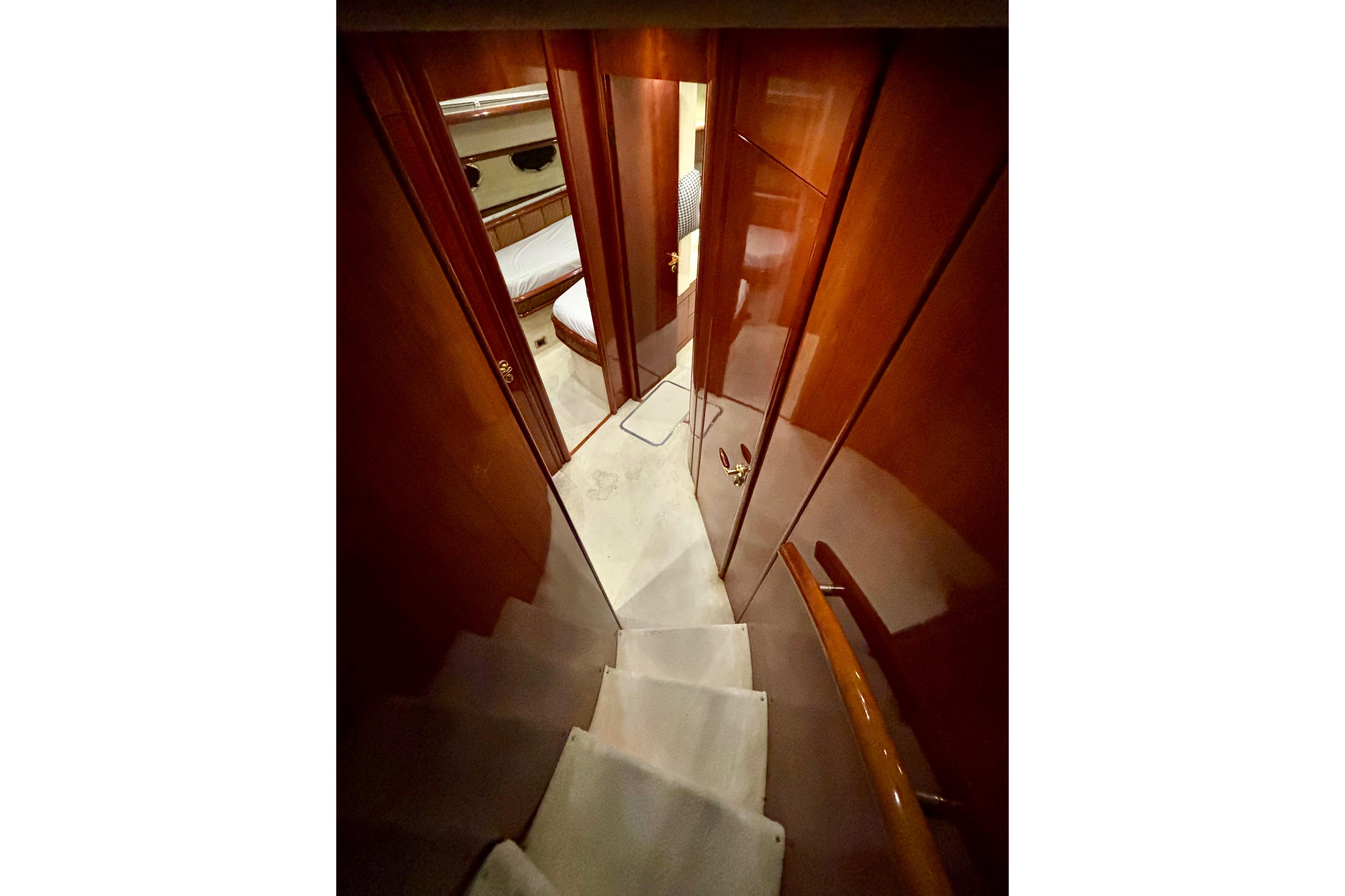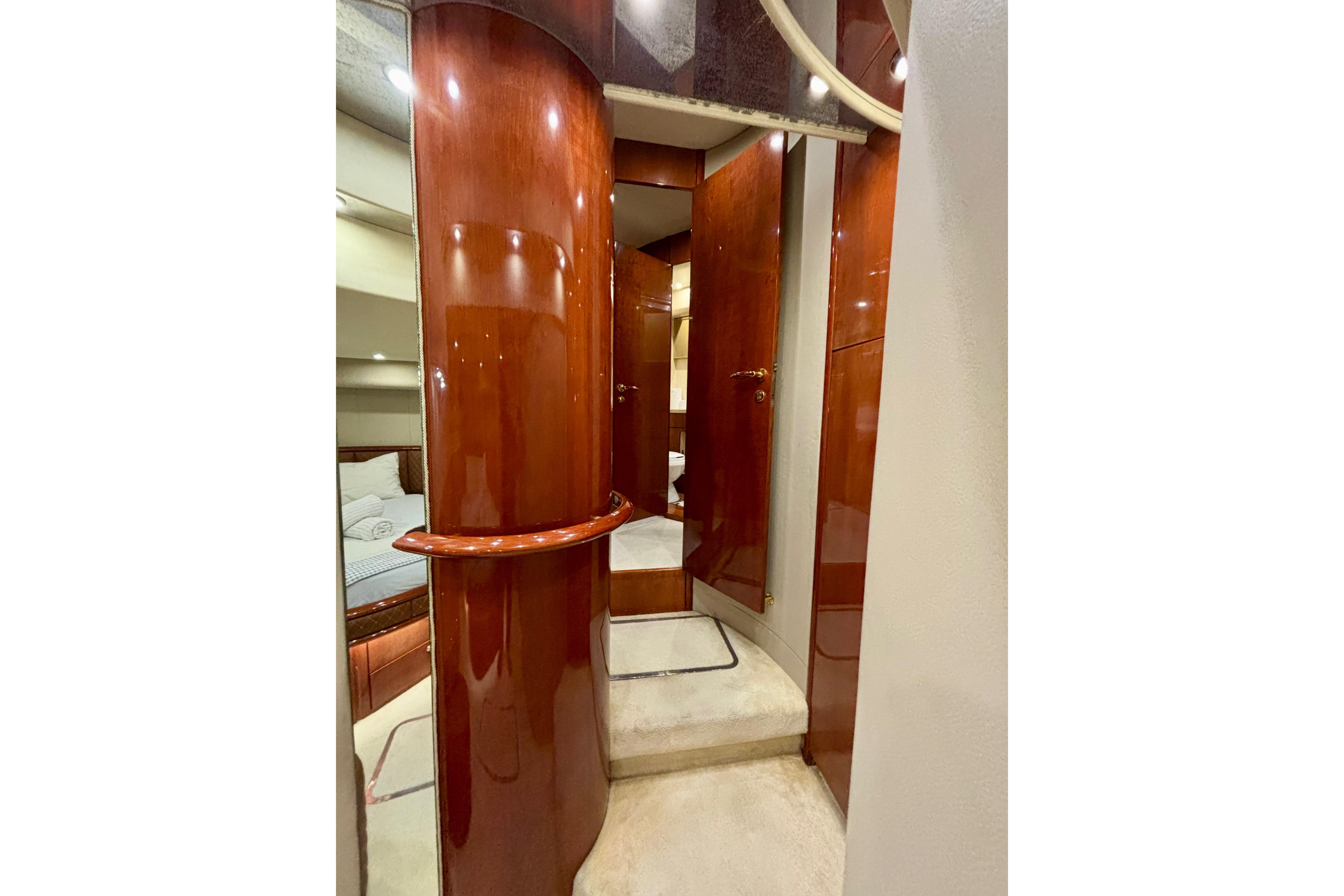 The Fairline Squadron 62 invokes the secure and confident feeling of a much larger boat - especially when passengers walk around the solid, wide, bulwark-edged decks for the first time. The large elegant flybridge is sociable in the truest sense of the word, with its commanding centerline helm position, two adjoining crew seats, and a large sunbed directly in front of the helm. The design is mirrored by the oval-shaped seating and dining area, where the bar unit, sink, fridge, and electric barbecue griddle are de rigeur. Quite apart from its eight-seater settee arrangement, the spectacular saloon features a raised dining area with a six-seater table, and a separate bar area with its own fridge, icemaker, and bar stools. The central lower helm position has electrically adjustable seats, a wrap-round control console, and immediate access to the side deck through an aircraft-style side door.