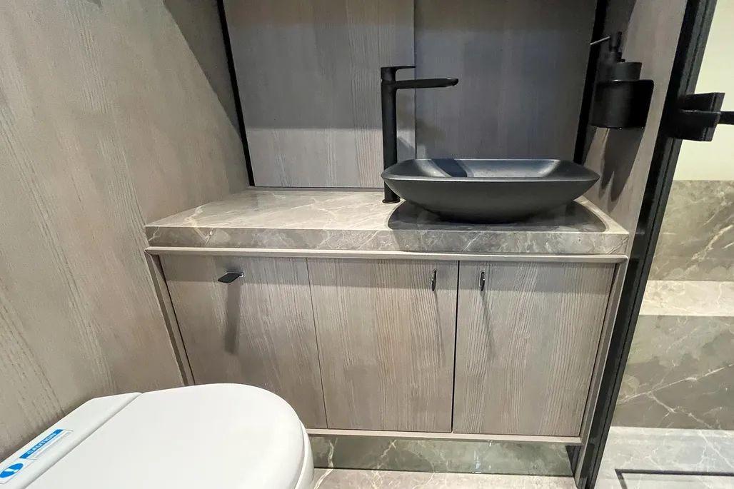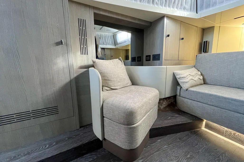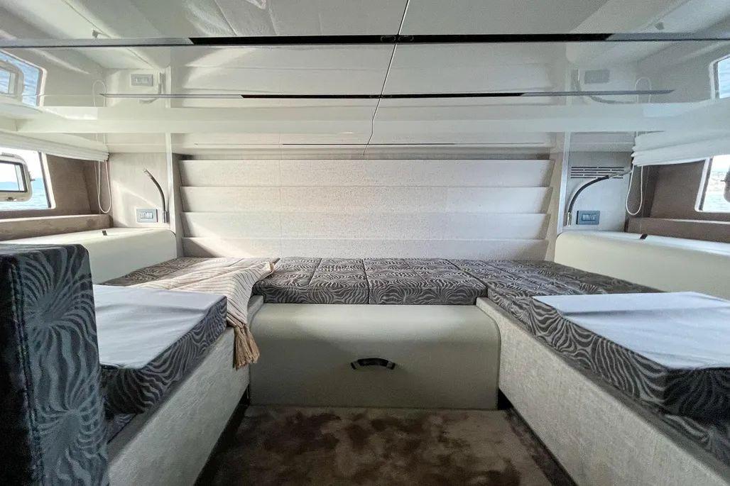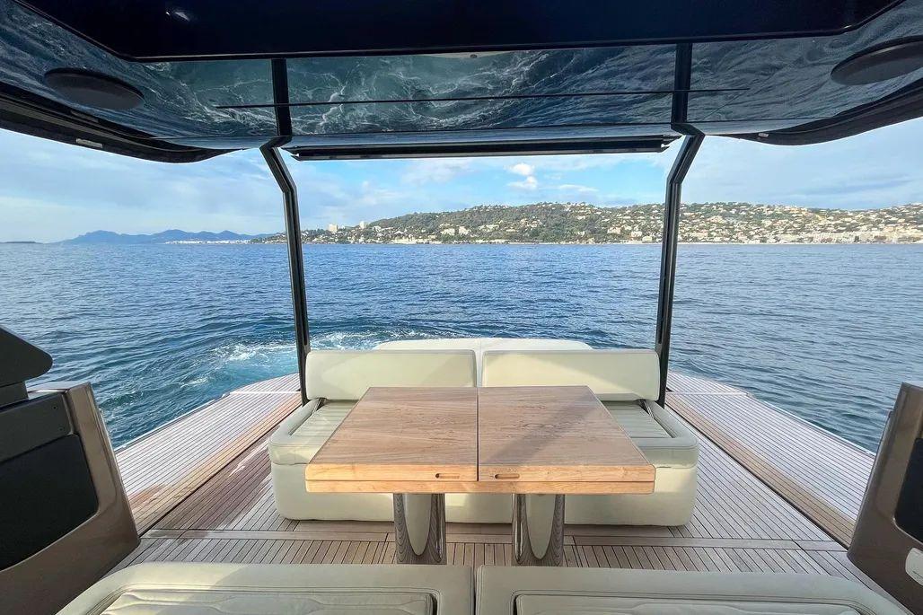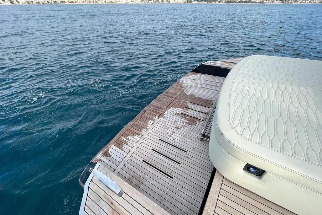 Este modelo de líneas elegantes y diseño italiano de alta gama combina lujo, rendimiento y confort: equipada con motorización 2 × Volvo Penta D6-480 IPS650 (2 × 480 CV/HP), ofrece una navegación ágil, silenciosa y de alto nivel. Su amplio solárium de popa, plataforma hidráulica, bañera en teca y pasarela hidráulica completan la experiencia exterior de primera clase.
