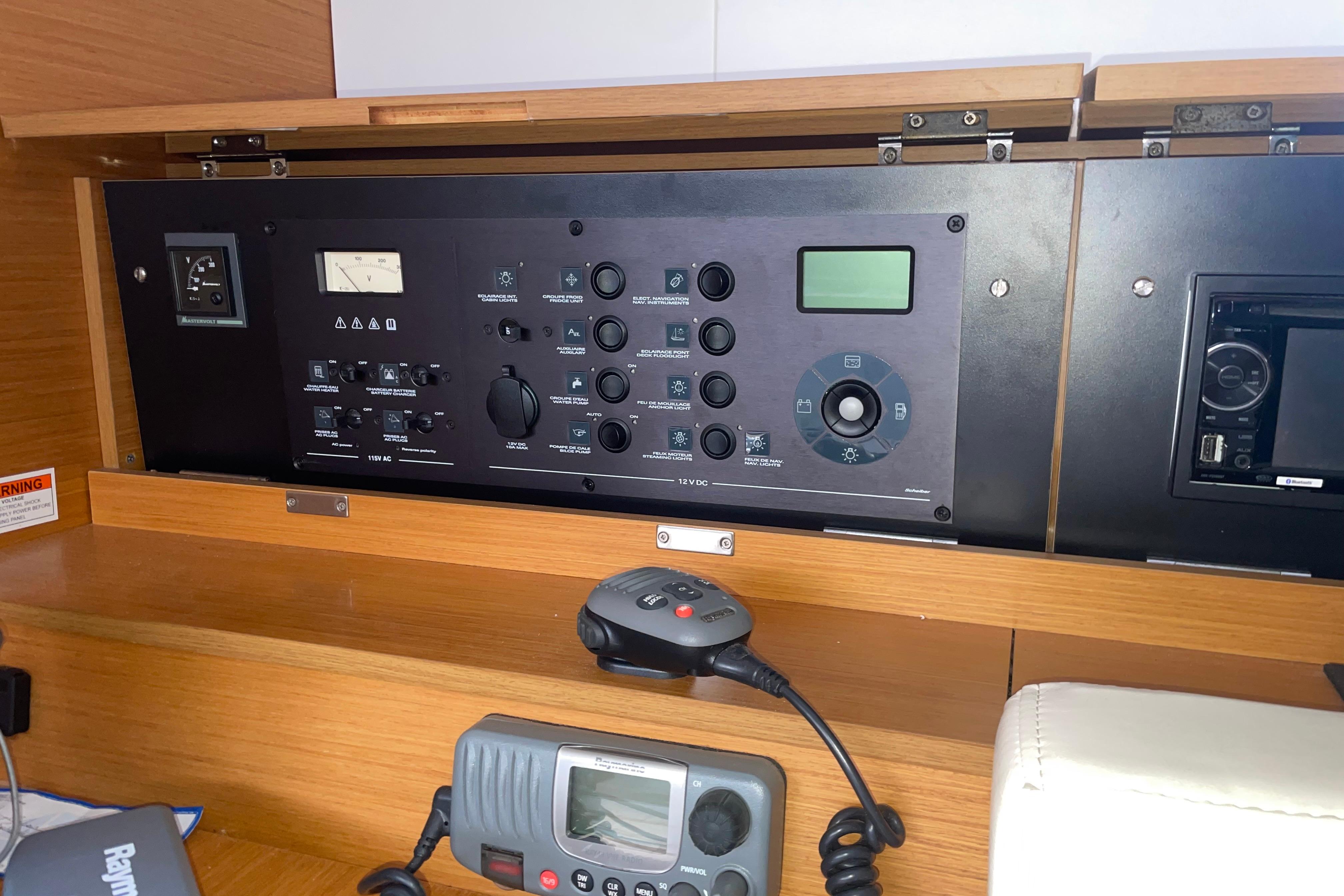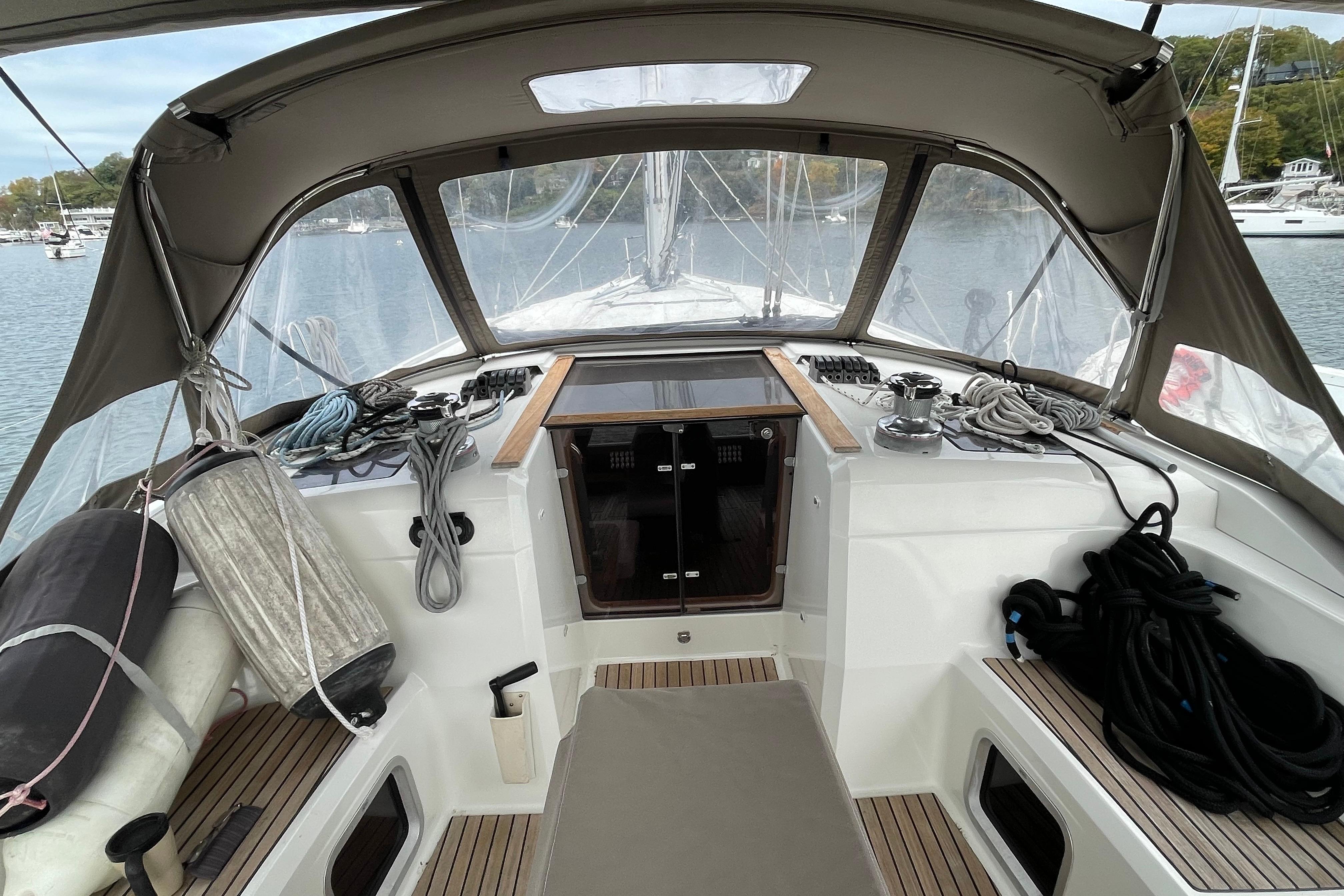 Equipment and Running GearFeaturing a 3-blade folding propeller, electric deck wash seapump, and an electric drive for the fold-down swim platform with swim ladder. The cockpit includes a folding table, wood floor and seats, and comfortable cushions. Additional gear includes a Delta anchor with chain and windlass control with chain counter, electric and manual bilge pumps, double lifelines with bow and stern rails, docklines, fenders, dodger, bimini, and wheel covers.
