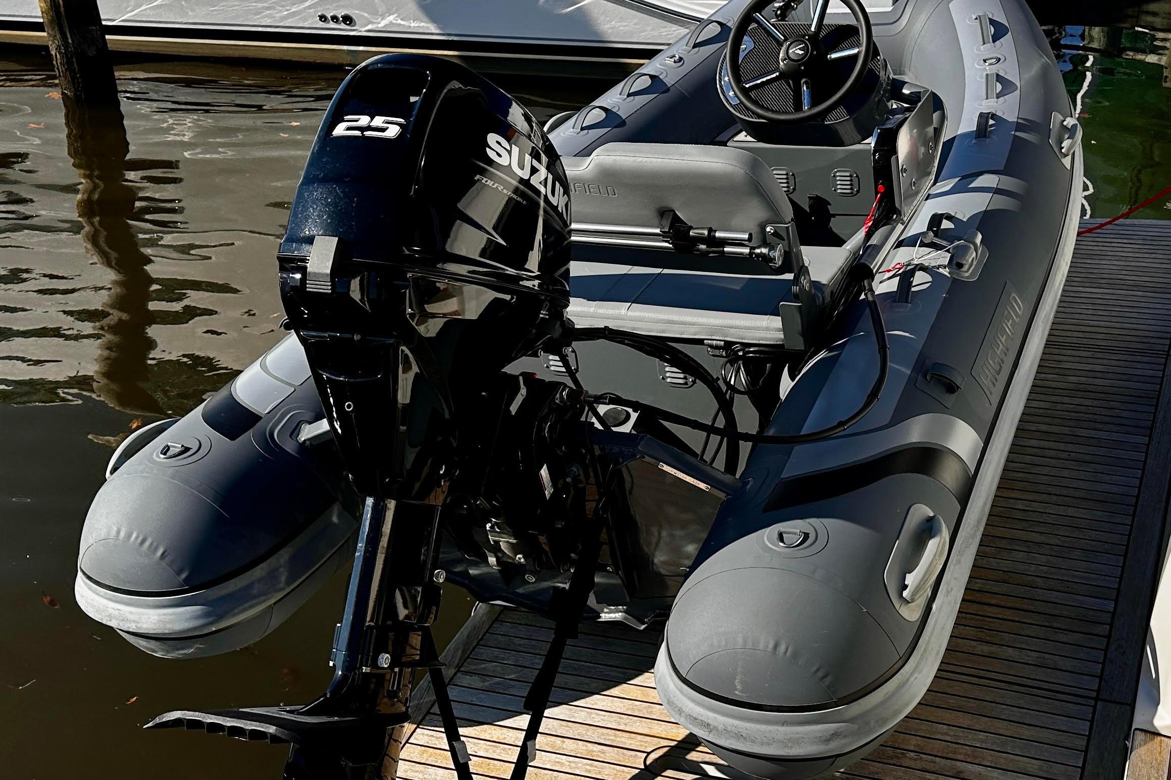 -2025 Highfield 340 Aluminum tender W AST remote and Garmin GPS/depth. 25hp Suzuki OB