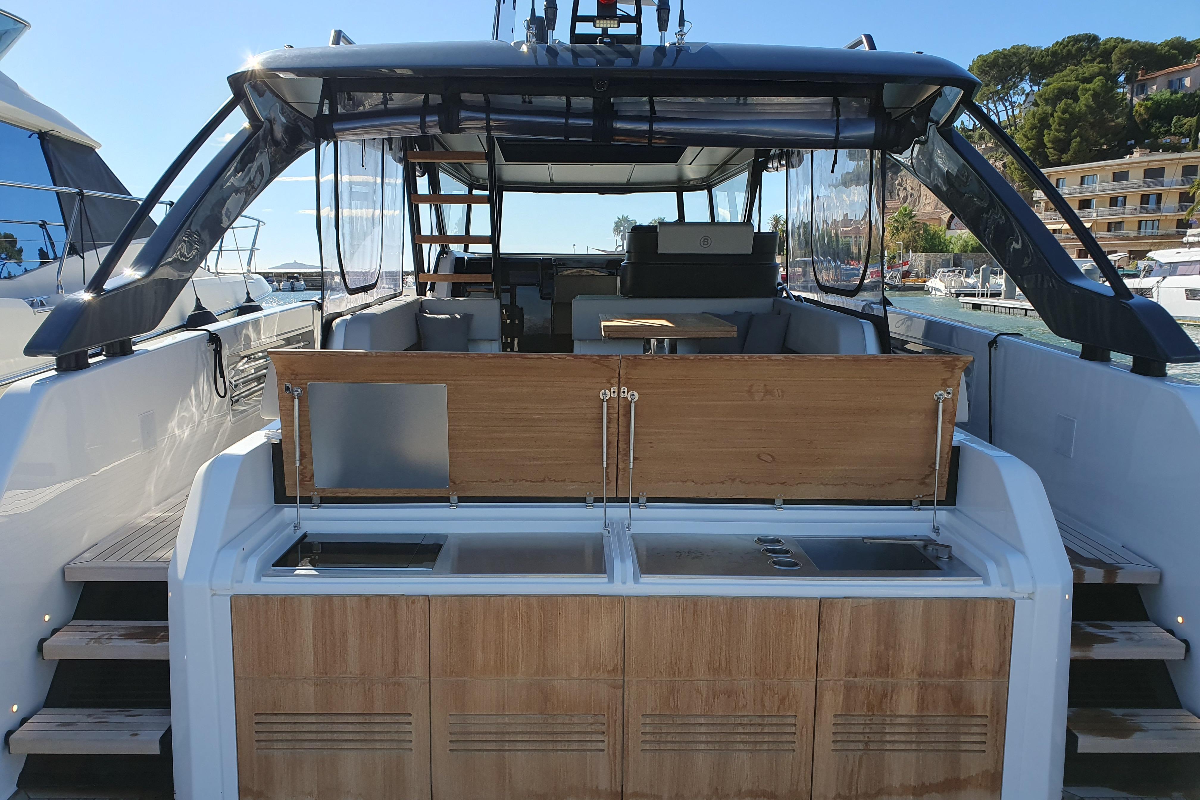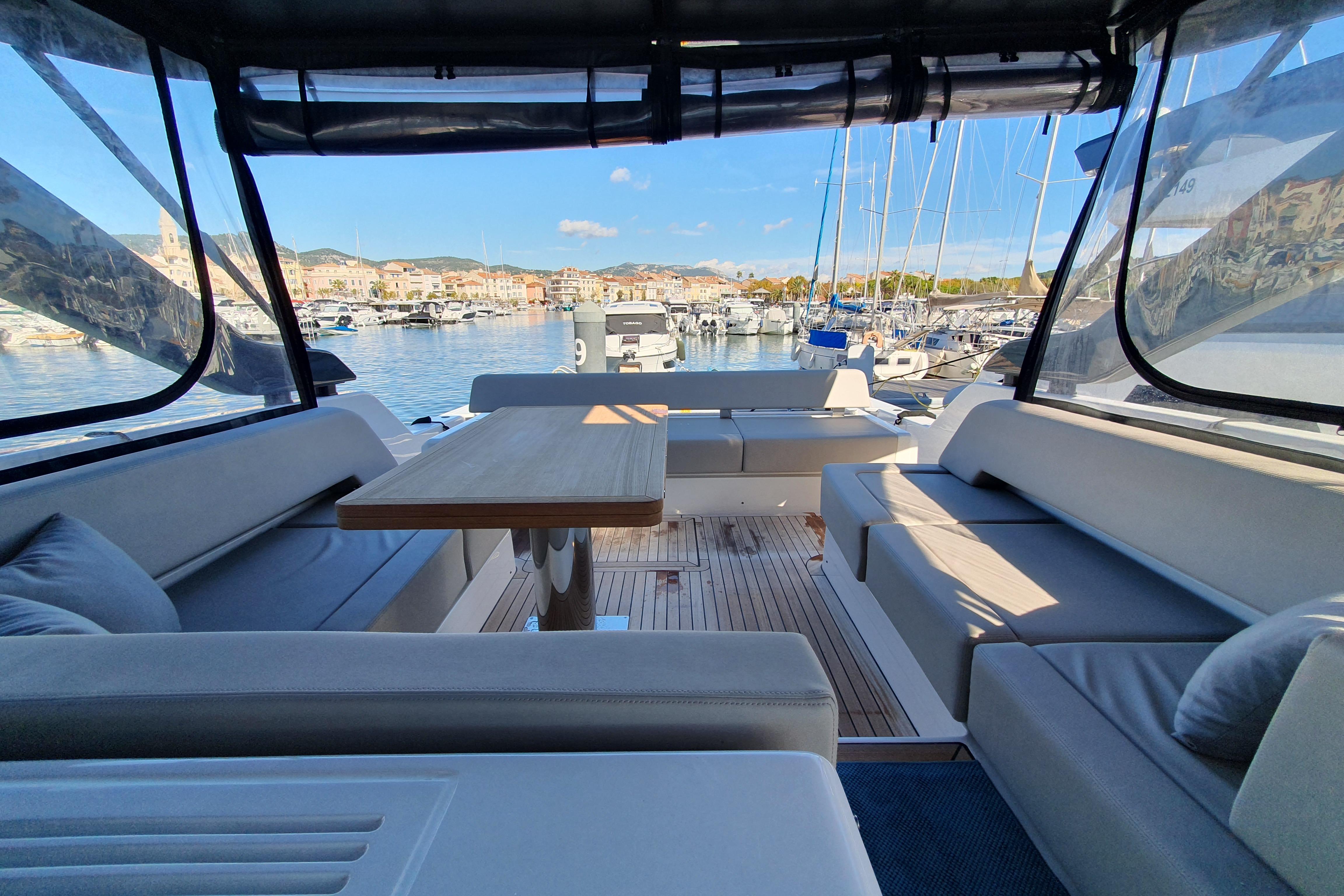 The semi-enclosed cockpit can be fully protected with flexible clear panels and offers heating or air conditioning for year-round enjoyment.