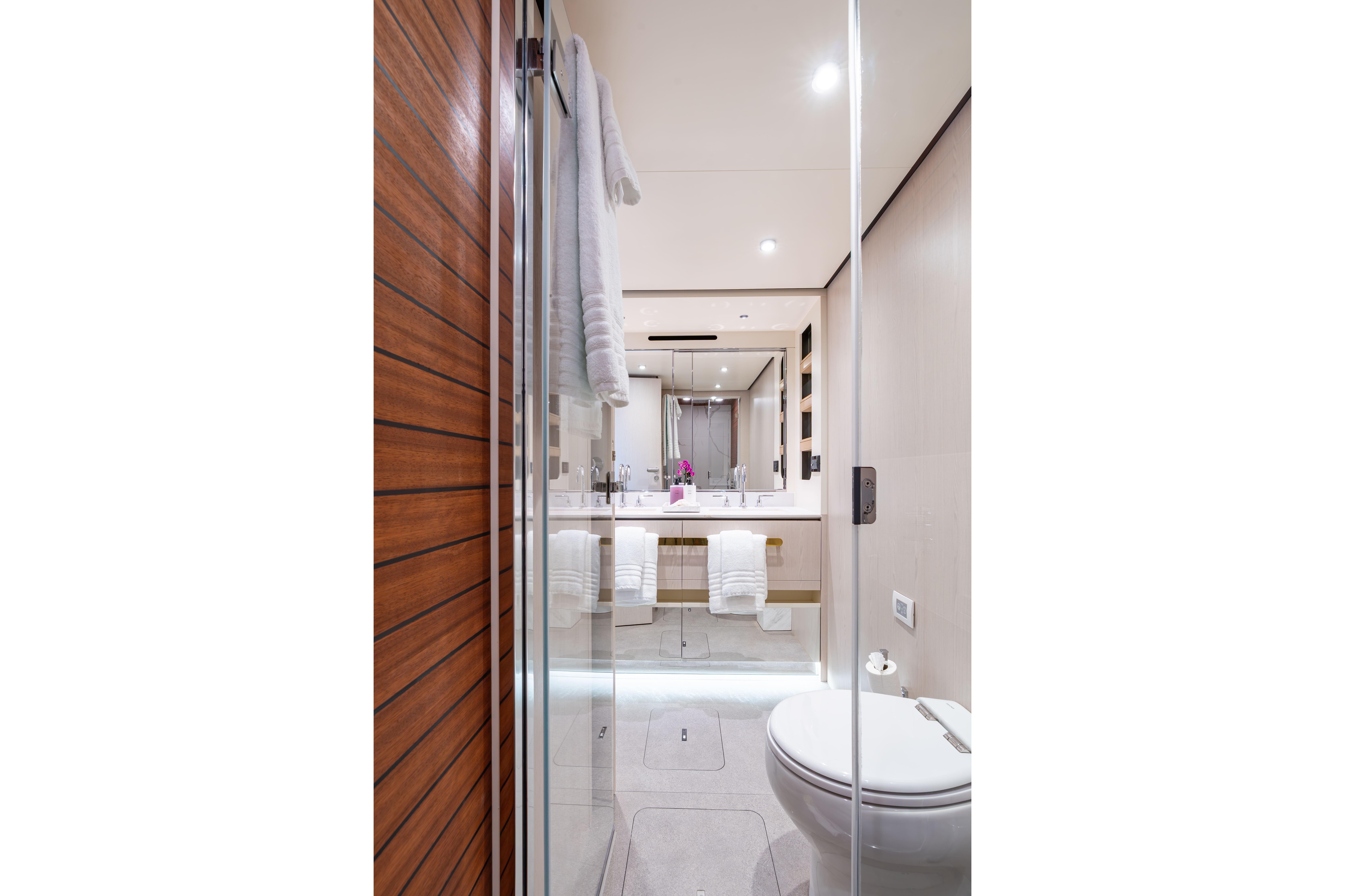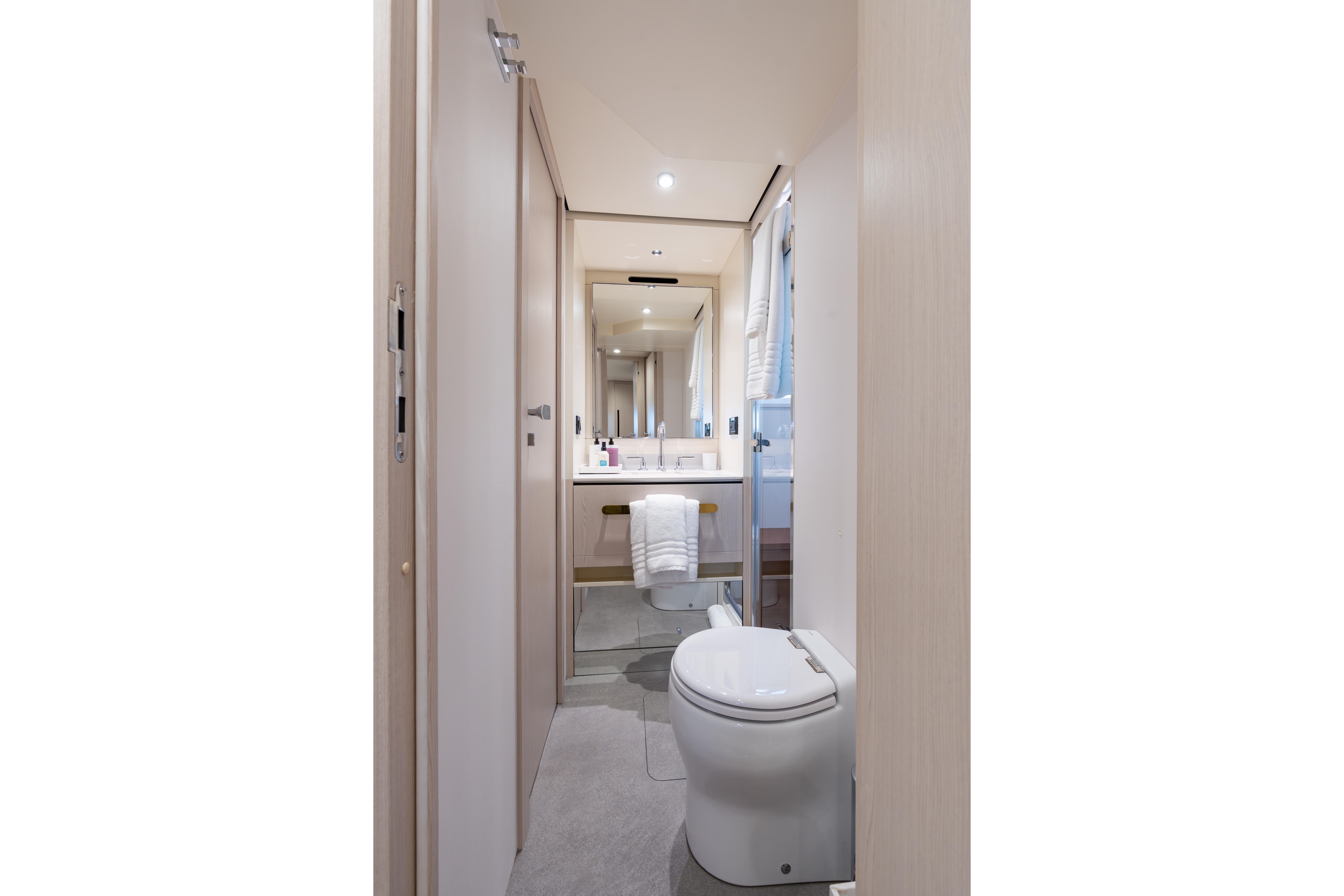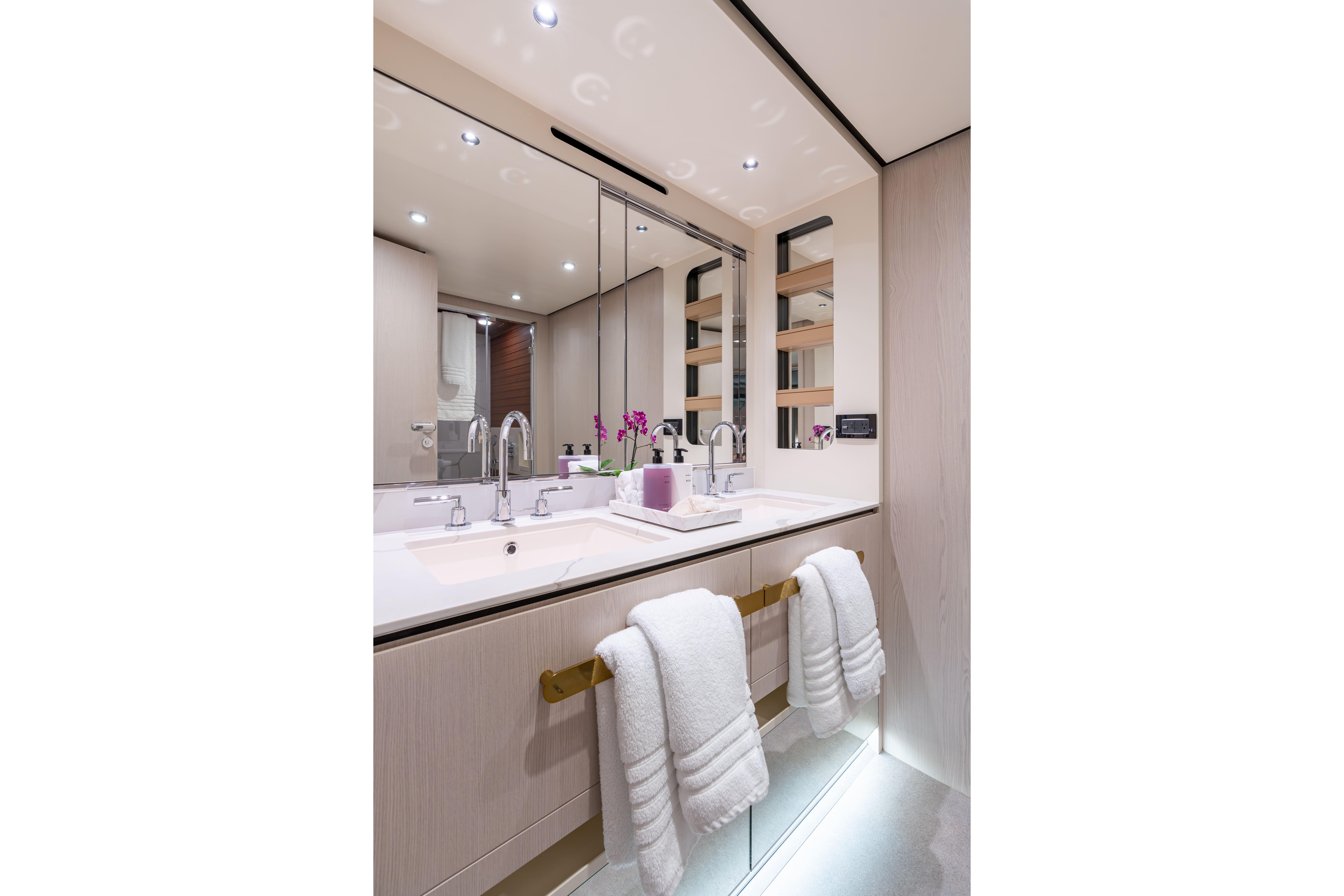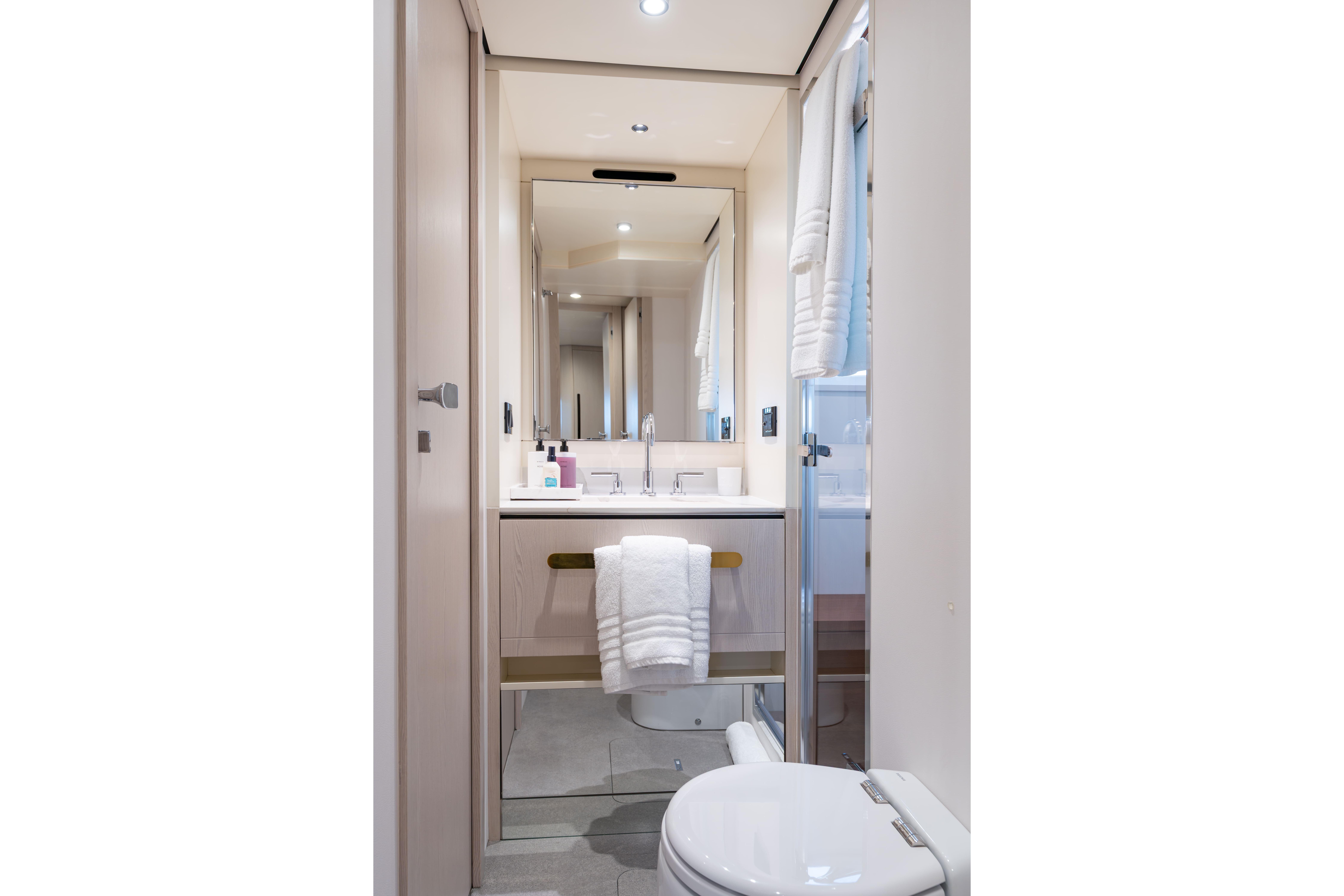 Designed for both comfortable cruising and effortless operation, the layout offers four staterooms and four heads, along with three dedicated crew berths and a separate crew head. The full-beam master stateroom provides generous space and privacy, while the additional guest accommodations are well appointed and thoughtfully arranged, making this yacht equally suited for owner-operators or crewed use.