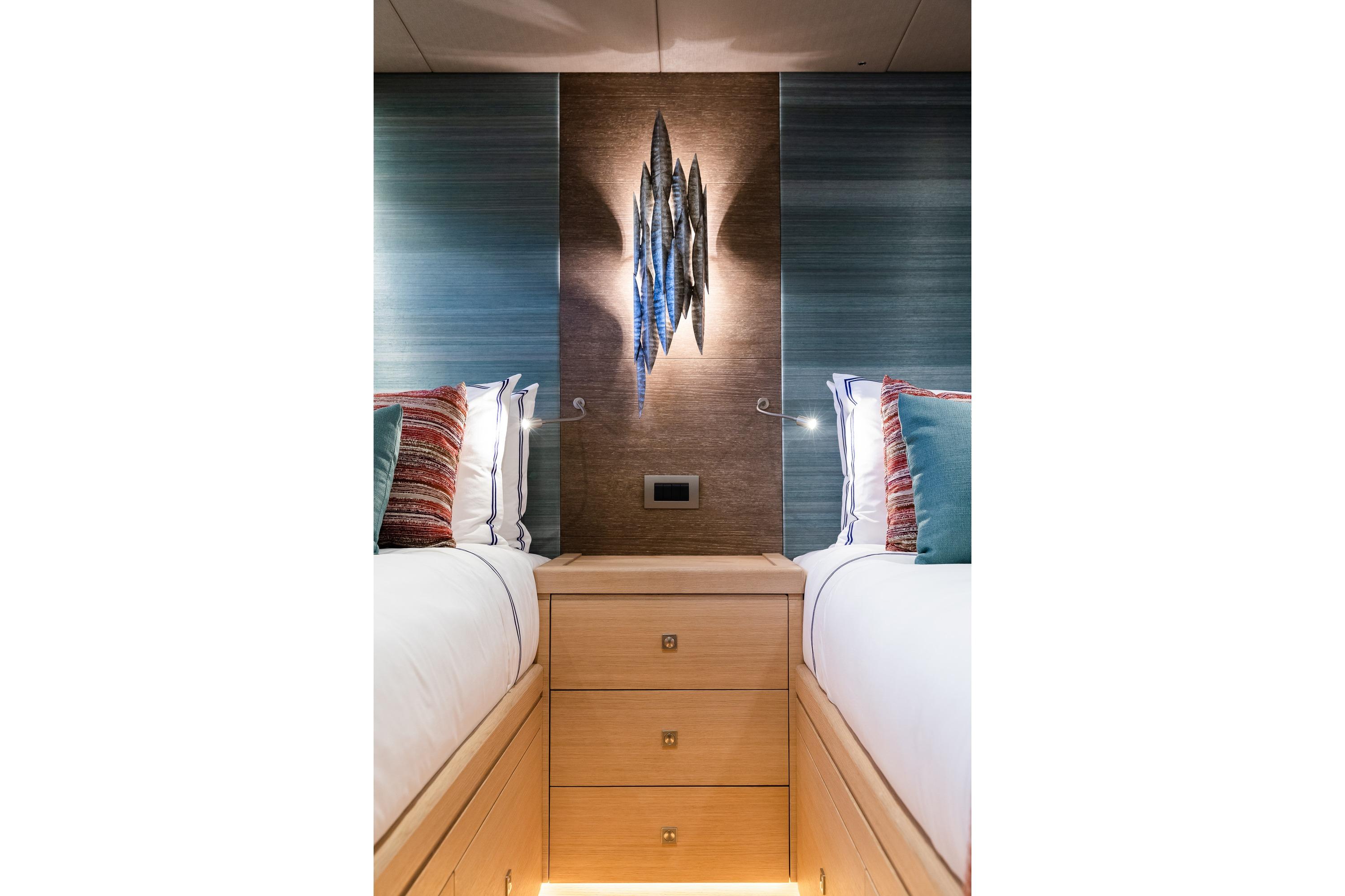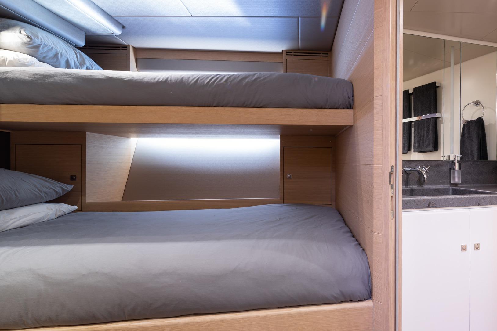 Aft of the saloon are two identical sumptuous twin staterooms each with single berths, private head/shower, fixed topside portlights, and hanging and drawer storage. There are also removable single carbon pipe berths in each aft guest cabin.