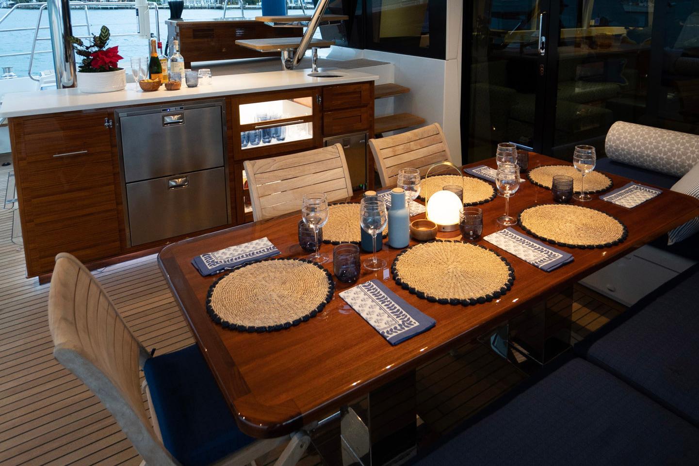 - Aft deck Wet Bar with Ice Maker, Beverage Refrigerator, and Storage Locker
