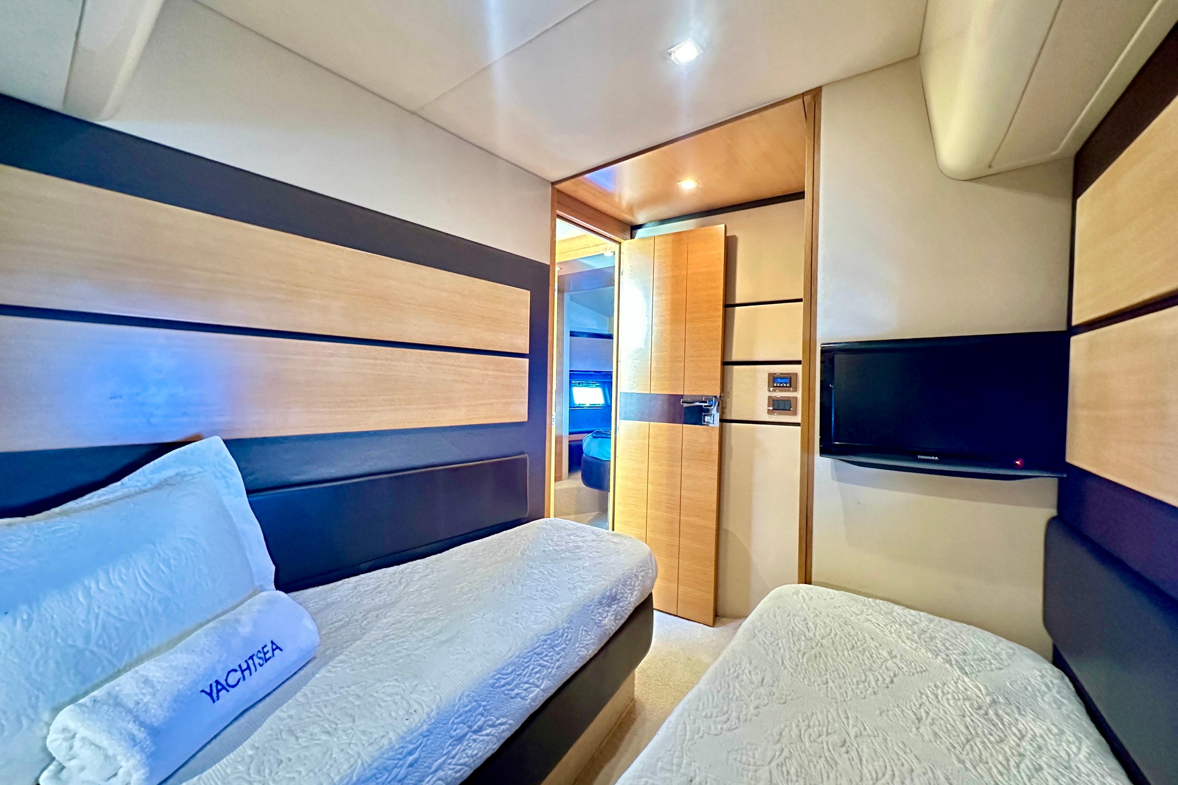 Inside, you’ll find the signature Azimut attention to detail: rich cabinetry, leather upholstery, and expansive windows that fill the salon with natural light. The galley is equipped with full-size appliances and ample storage. Below deck, the full-beam master cabin offers a luxurious retreat, complemented by a VIP cabin forward and a twin guest cabin to port.